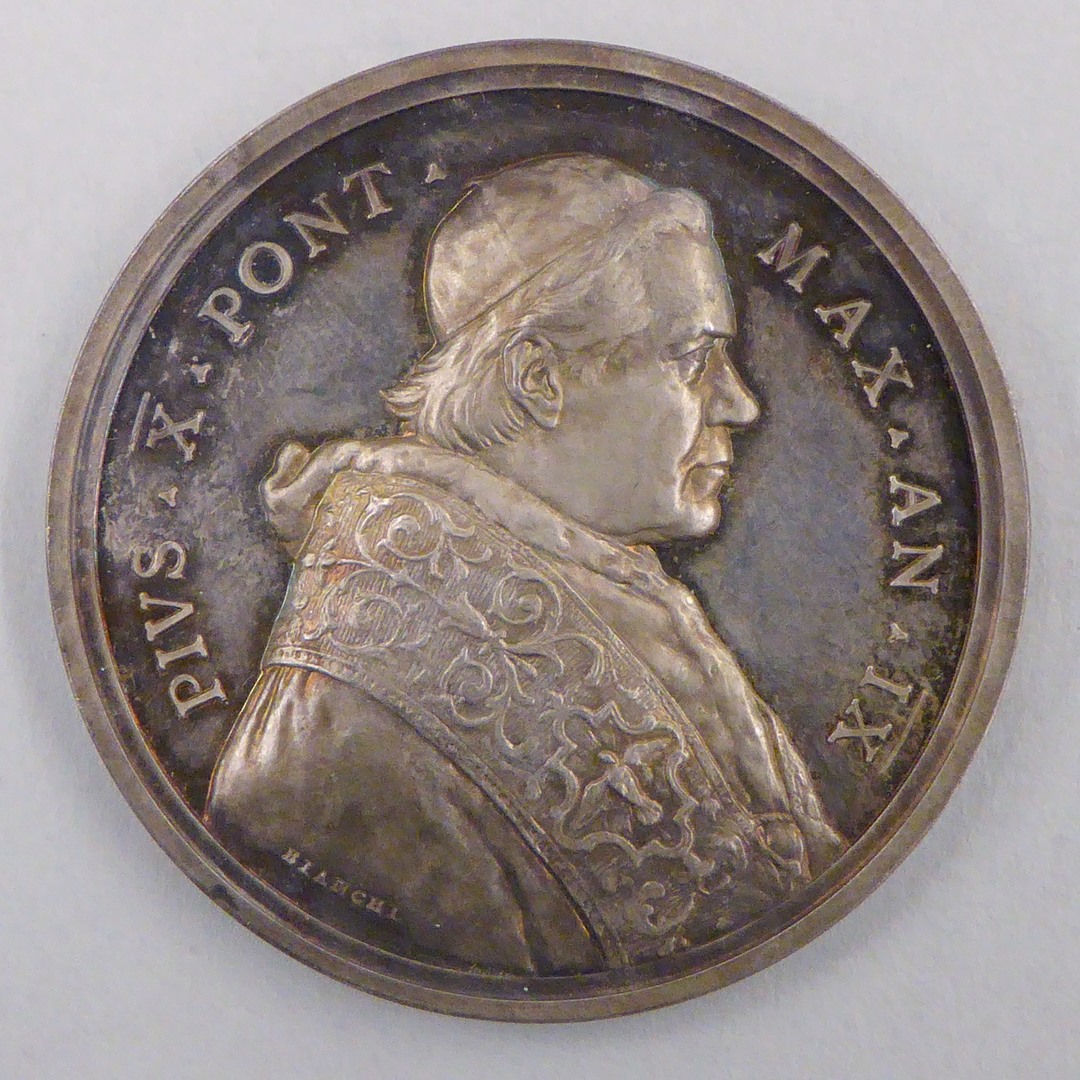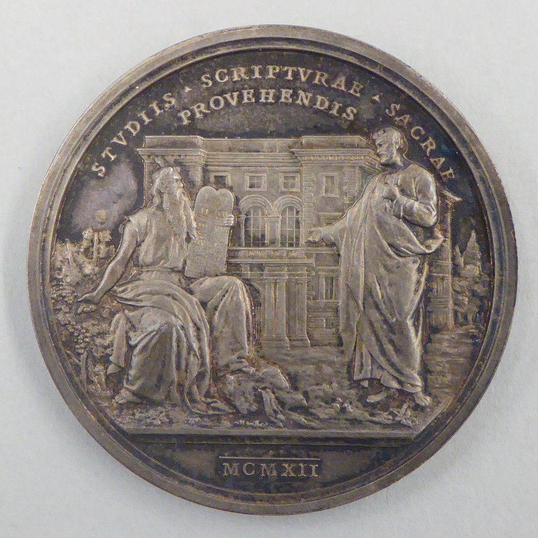 Pauspenning met portret paus Pius X (1903-1914), kz. nieuw bijbelinstituut met Mozes en Petrus