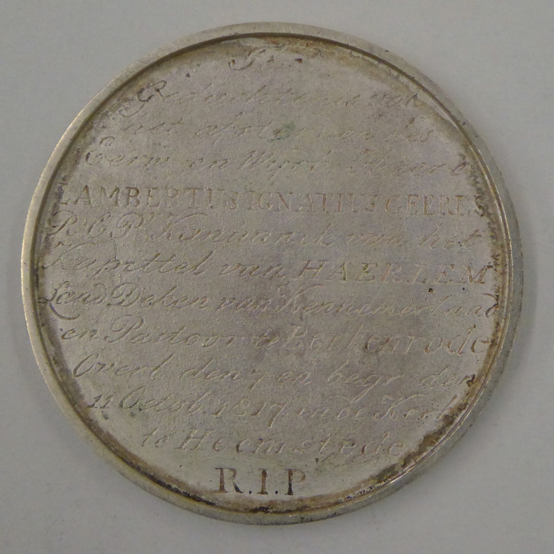 vz.: Ter gedachtenis van het afsterven des Eerw. en Wijdb. Heere Lambertus Ignatius Geeres, R.C.P., Kanunnik van het Kapittel van Haarlem, LandDeken van Kennemerland en Pastoor te Berkenrode. Overl. den 7en begr. den 11 Octob. 1817 in de Kerk te Heemstede. R.I.P. kz.: Naald, palmbomen en een figuur die het Geloof voorstelt. Op het basement ...
