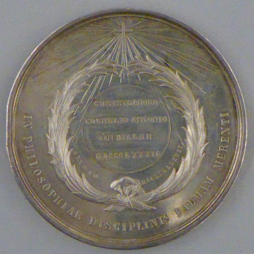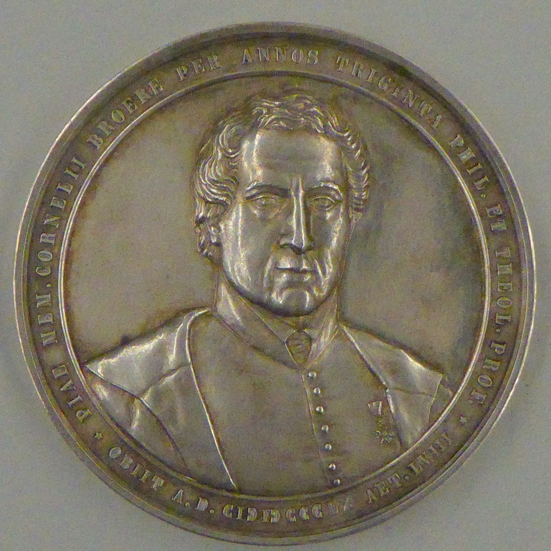 Vz.: PIAE. MEM. CORNELII. BROERE. PER. ANNOS. TRIGINTA. PHIL. ET. THEOL. PROF. OBIIT. A. D. MDCCCLX. Kz.: IN. PHILOSOPHIAE. DISCIPLINIS. PALMAM. MERENTI/ CHRISTOPHORO. CORNELIO. ANTONIO. VAN. DILLEN. MDCCCLXXXII/ ALVMNO. HAGEVELDENSI.