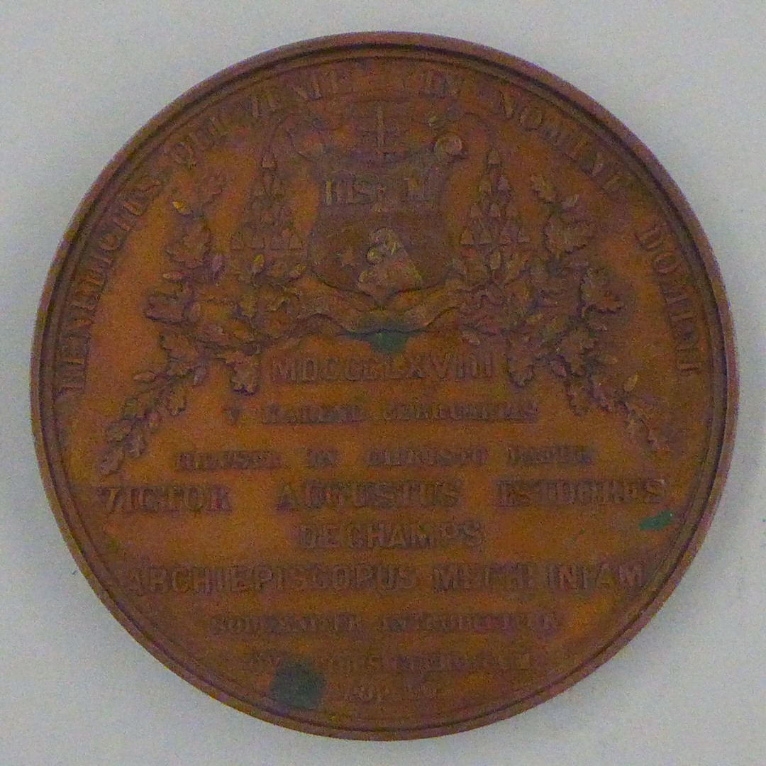 Vz.: VICTOR. AUGUST. ISIDOR. DECHAMPS. CONGR. S. S. REDEM. ARCHIEP. MECHLIN. PRIMAS. BELGII. Kz.: BENEDICTUS. QUI. VENIT. IN. NOMINE. DOMINI. MDCCCLXVIII. V. KALEND. FEBRUARIAS. ILLUSTR. IN. CHRISTO. PATER. VICTOR. AUGUSTINUS. ISIDORUS. DECHAMPS. ARCHIEPISCOPUS. MECHLINIAM. SOLEMNITER. INTRODUCITUR. OVANTIBUS. CLERO. CUM. POPULO.