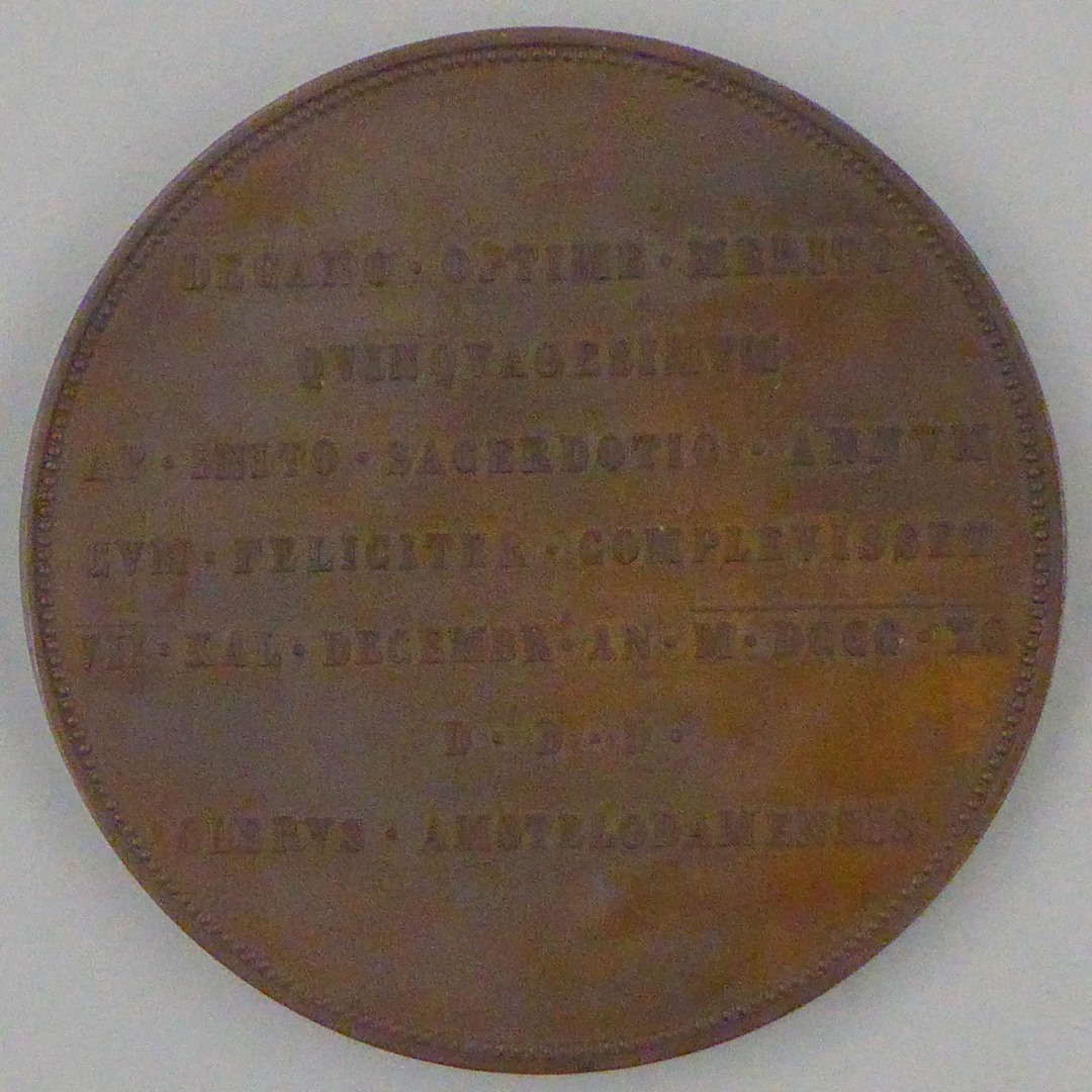 vz.: HENDR. POPPEN. SS. D. N. LEONIS. XIII. PRAEL. DOM. ECCL. CATH. HARL. CAN. DEC. AMSTELOD. kz.: DECANO. OPTIME. MERITO. QVINQVAGESIMVM. AB. INITO. SACERDOTIO. ANNVM. CVM. FELICITER. COMPLEVISSET. VII. KAL. DECEMBR. AN. M. DCCC. XC. D. D. D. CLERVS. AMSTELODAMENSIS.