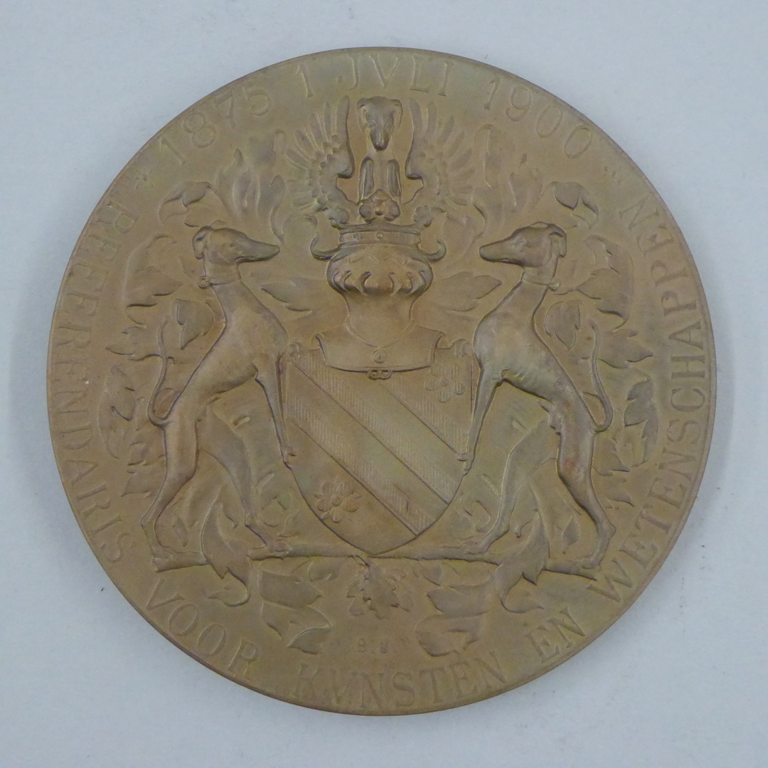 Gedenkpenning Victor de Stuers 25 jaar referendaris Kunsten en Wetenschappen, kz. wapen