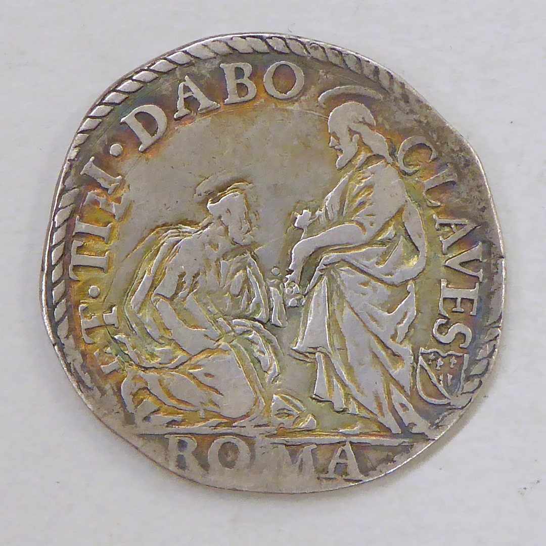 Testone met portret paus Gregorius XIII, kz. Christus overhandigt de sleutels aan Petrus