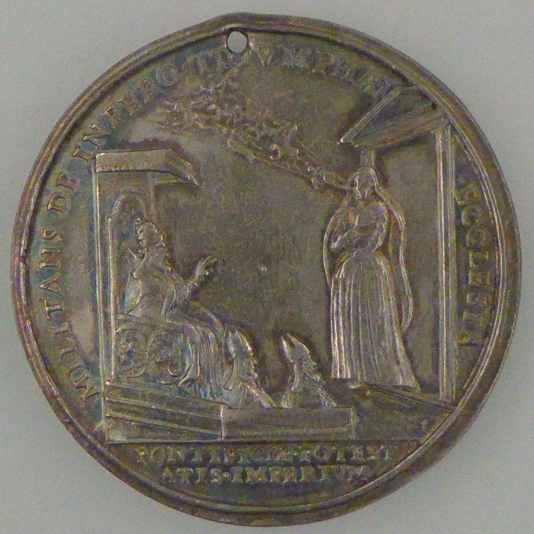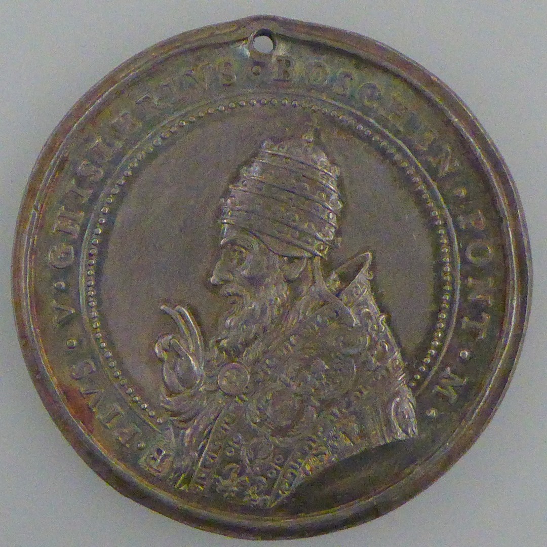 Pauspenning met portret paus Pius V, (1566-1572), kz. duiveluitdrijving