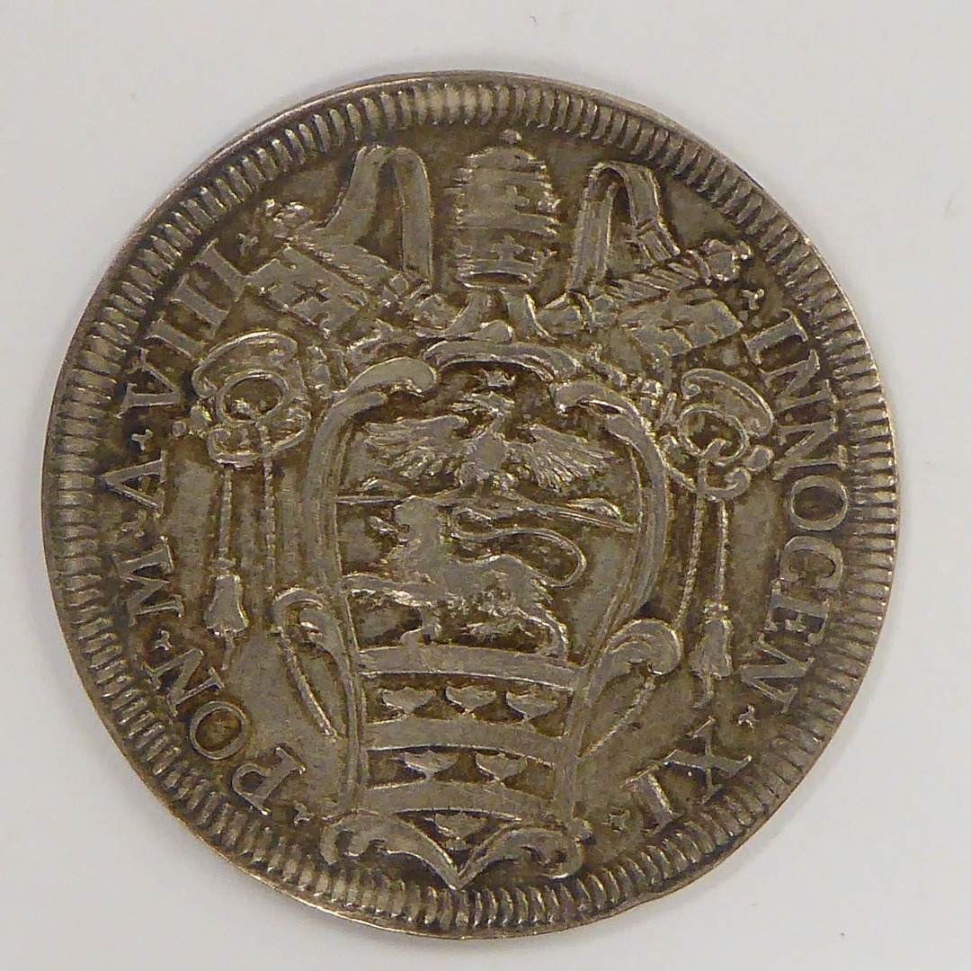 Testone paus Innocentius XI met wapen, kz. tekst in cartouche