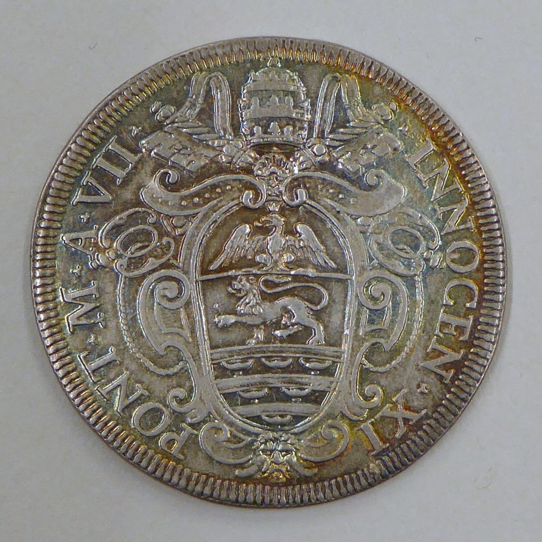 Halve piaster paus Innocentius XI met wapen, kz. tekst tussen palmtakken
