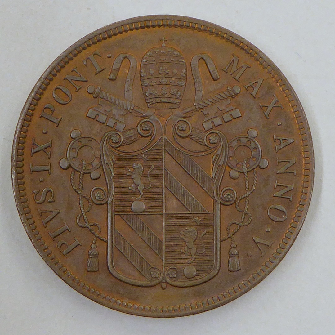 Vijf baiocci paus Pius IX met wapen, kz. tekst in olijfkrans