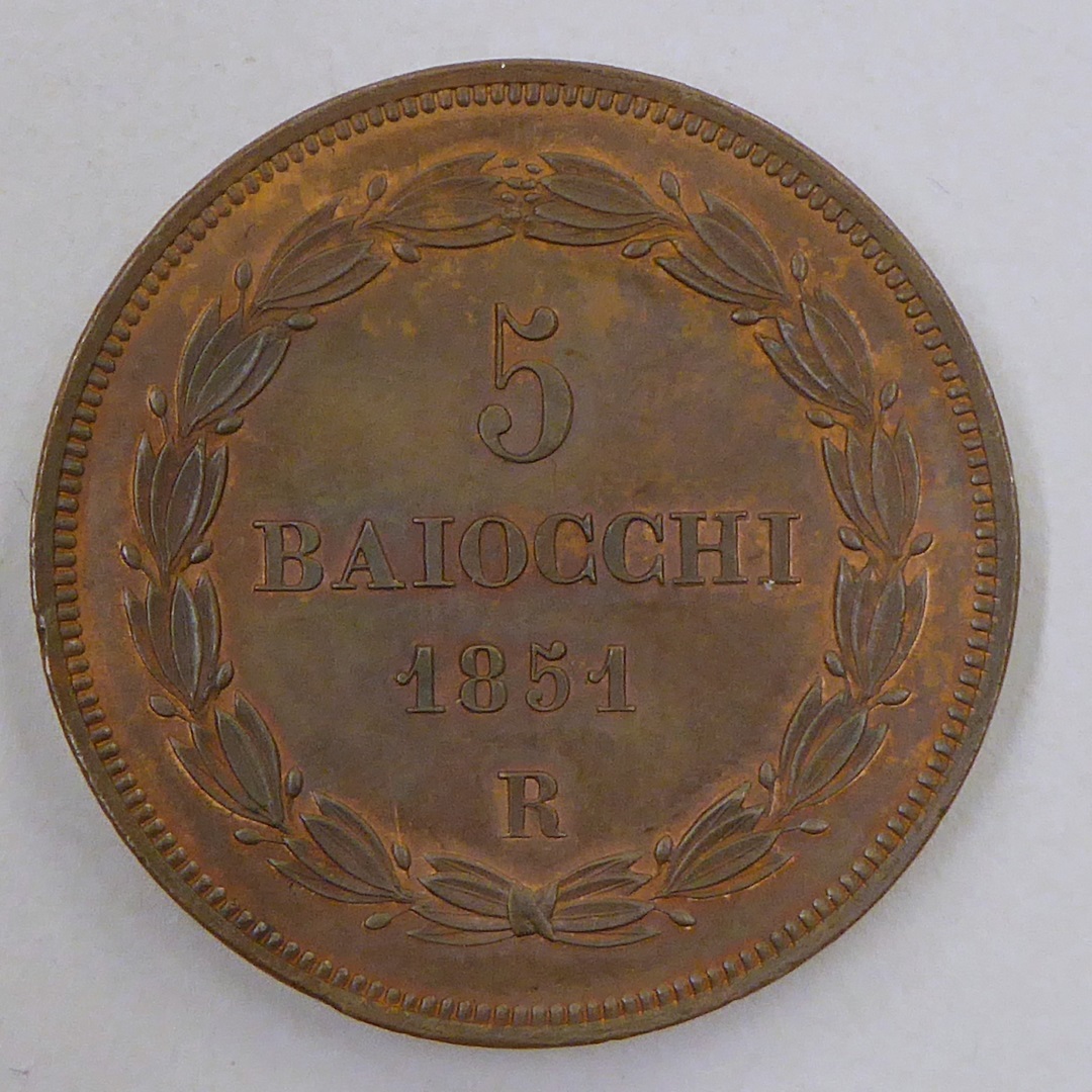 vz.: PIVS. IX. PONT. MAX. ANNO. V. kz.: 5 BAIOCCI / 1851 / R