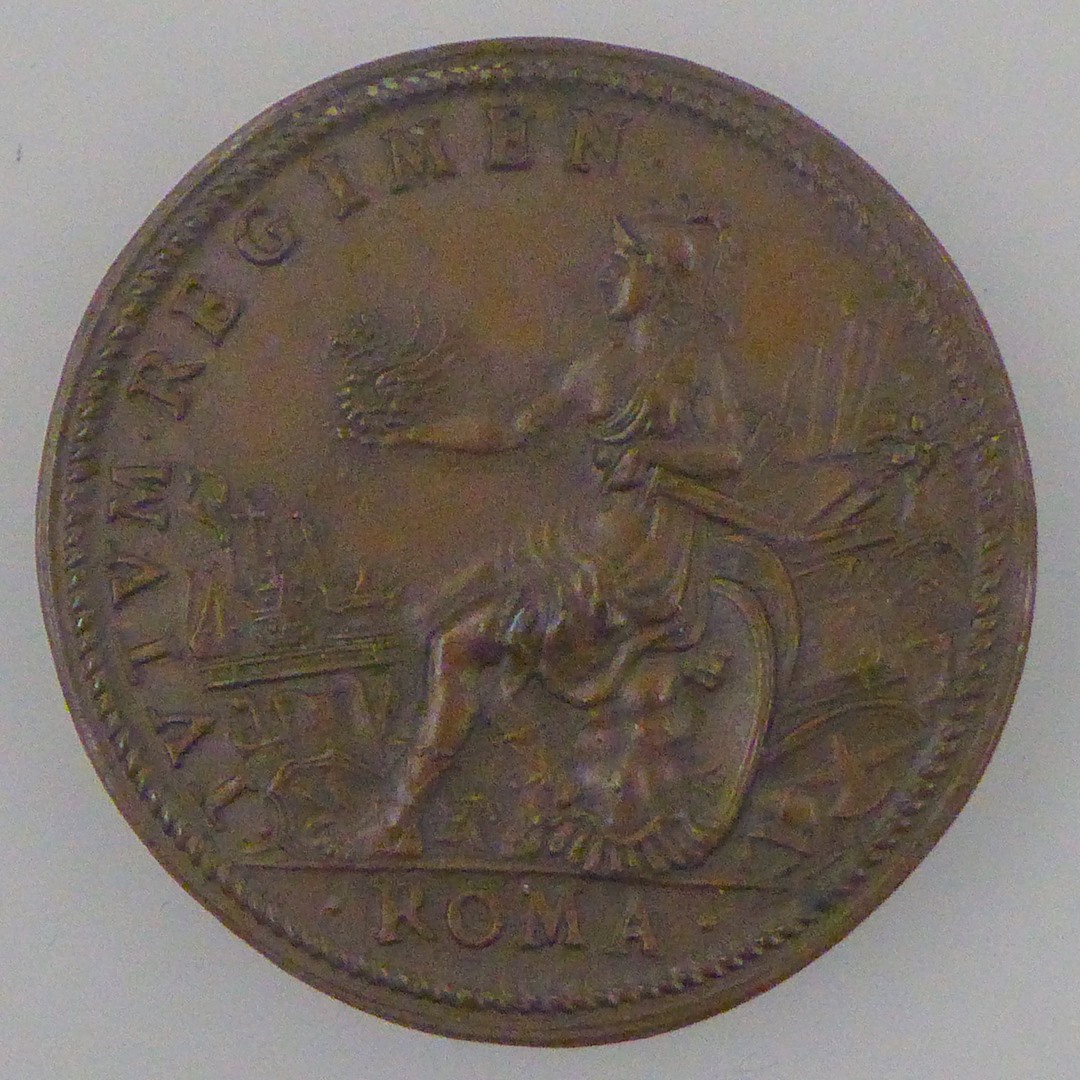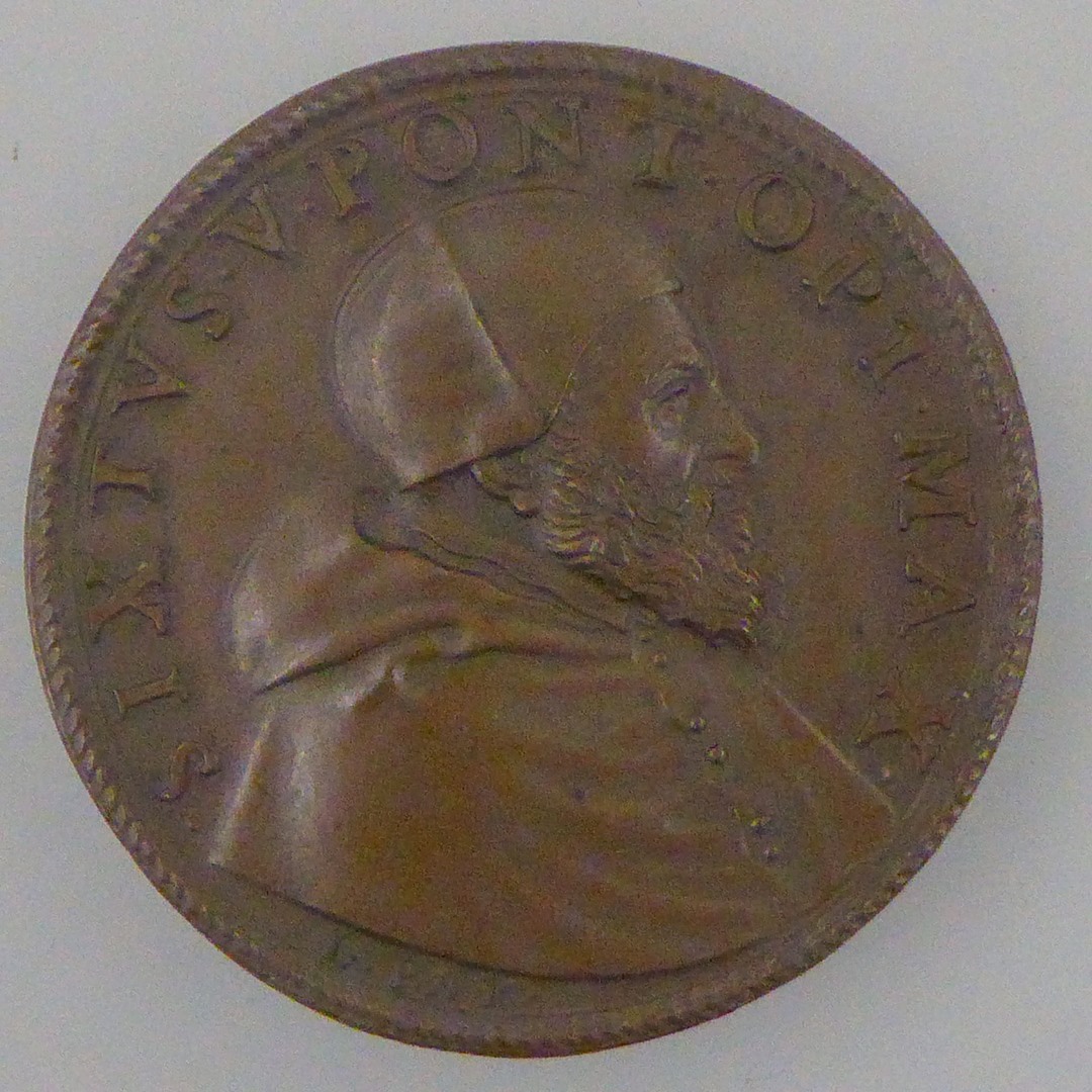 Pauspenning met portret paus Sixtus V (1585-1590), kz. Roma met in linkerhand zwaard, in rechterhand draak, met "Tutum regimen Roma"