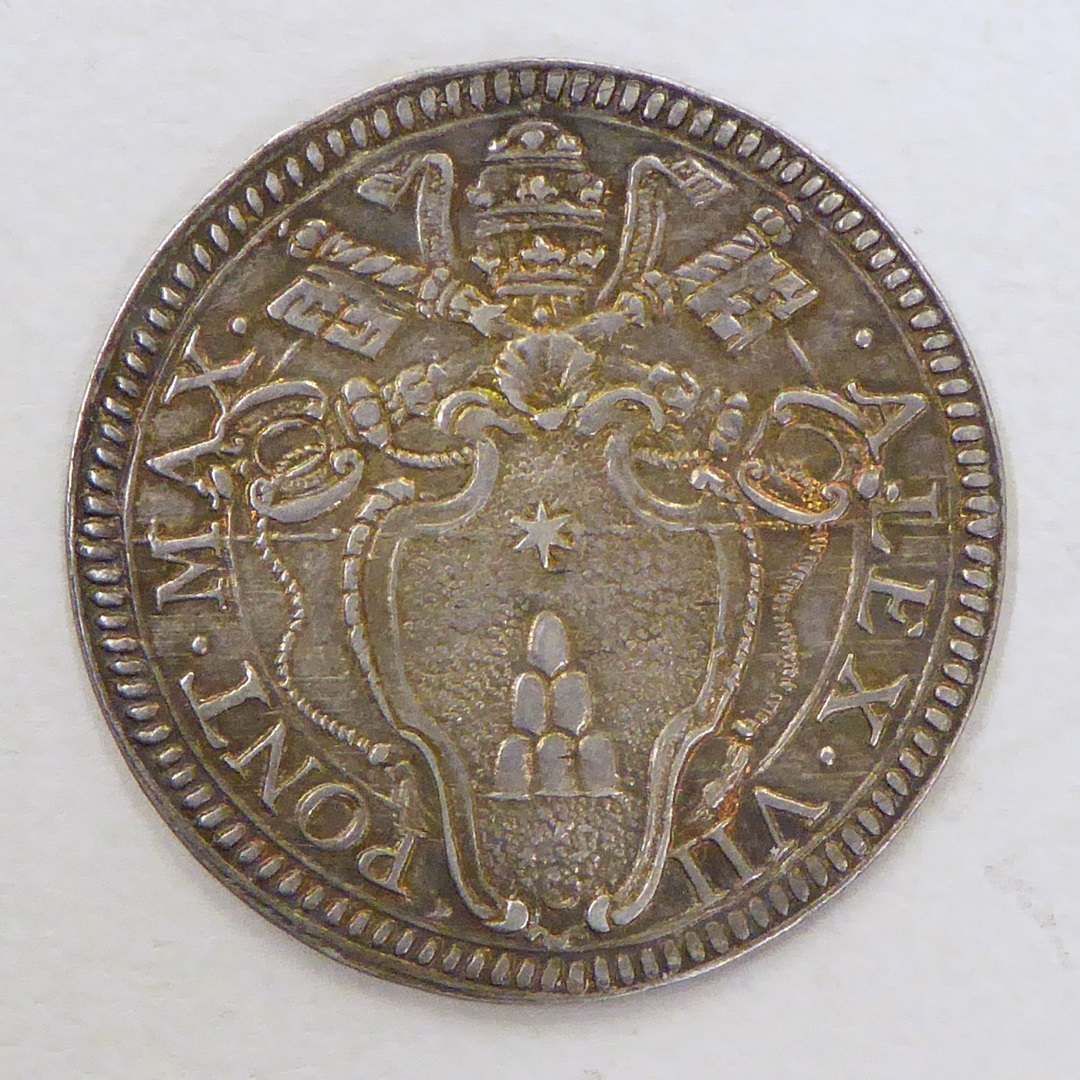 vz.: ALEX. VII. PONT. MAX. kz.: CVRA. PECVNIAM. CRESCENTEM. SEQVITVR
