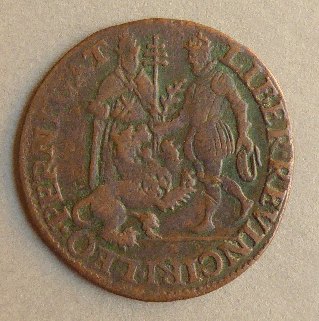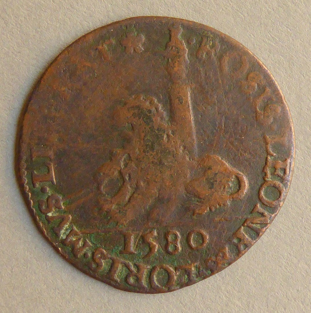 Penning met leeuw, paus en koning, kz. liggende leeuw, muis en zuil