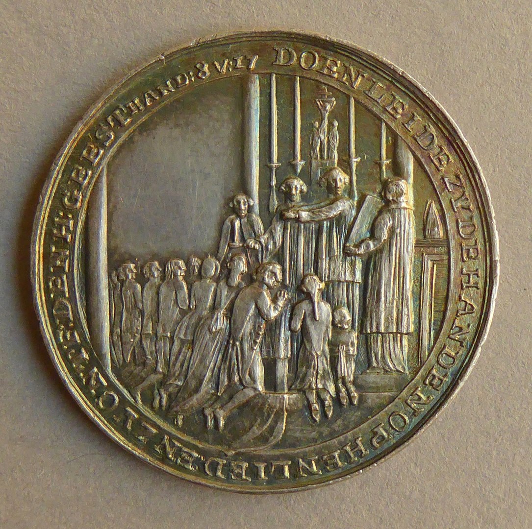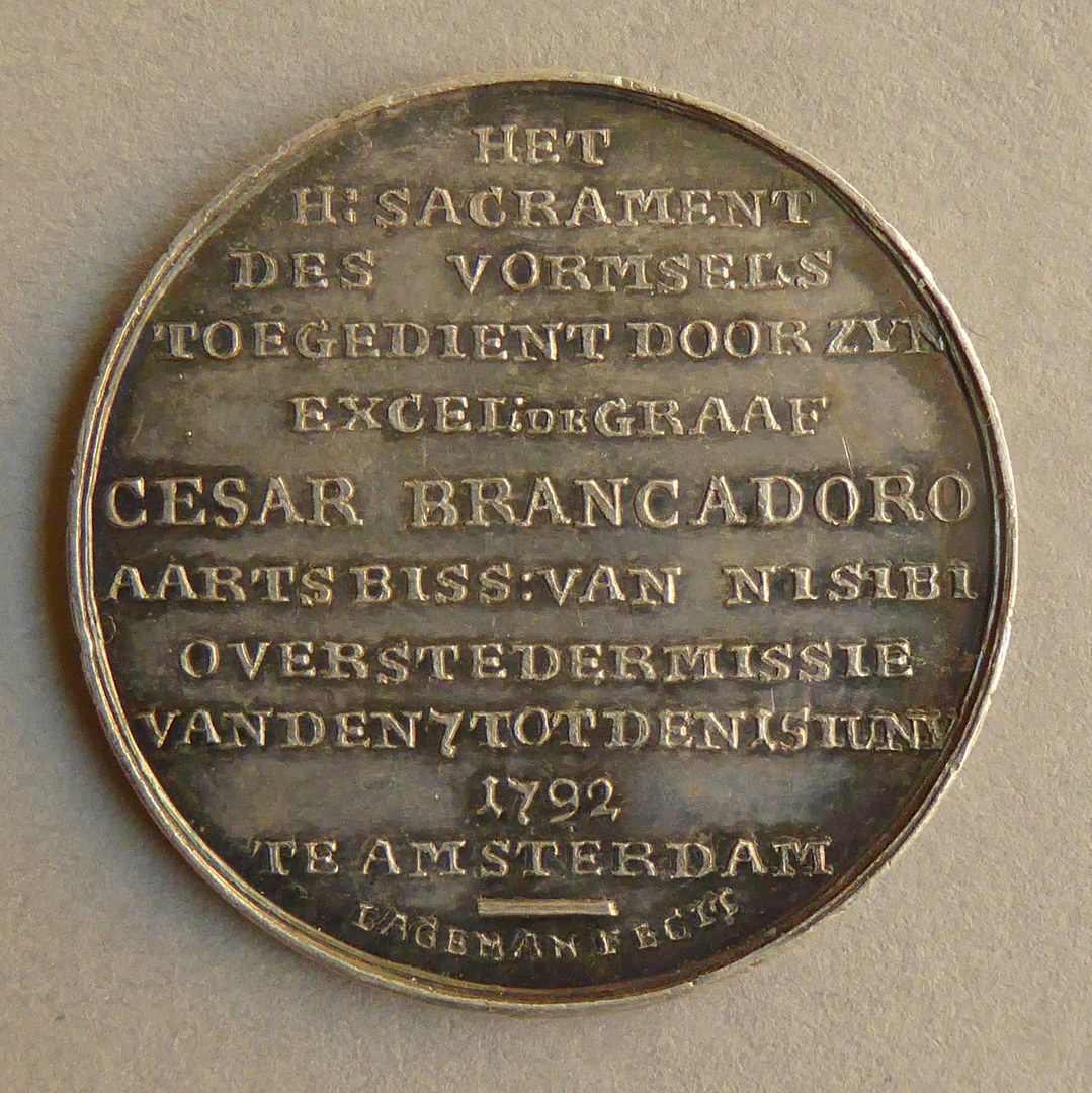 vz.: DOEN LEYDE ZY DE HANDEN OP HEN LIEDEN EN ZY ONTF: DEN H: GEEST HAND:3 V:17. kz.: HET / H: SACRAMENT / DES VORMSELS / TOEGEDIENT DOOR ZYN / EXCEL: DE GRAAF / CESAR BRANCADORO / AARTSBISS: VAN NISIBI / OVERSTE DER MISSIE / VAN DEN 7 TOT DEN 15 IVNI / 1792 / ...