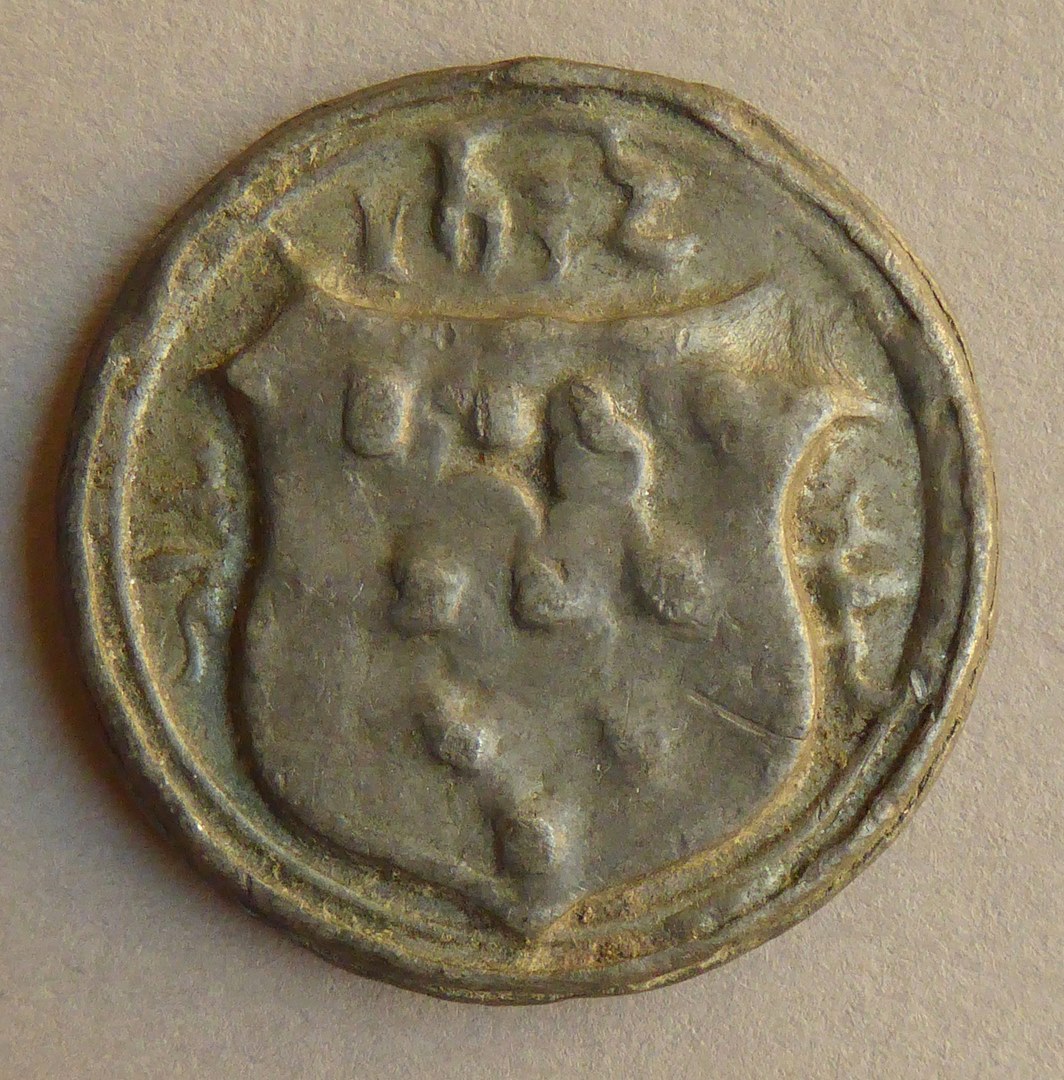 Armenpenning met wapenschild en vrouwenbuste, kz. wapenschild met bollen