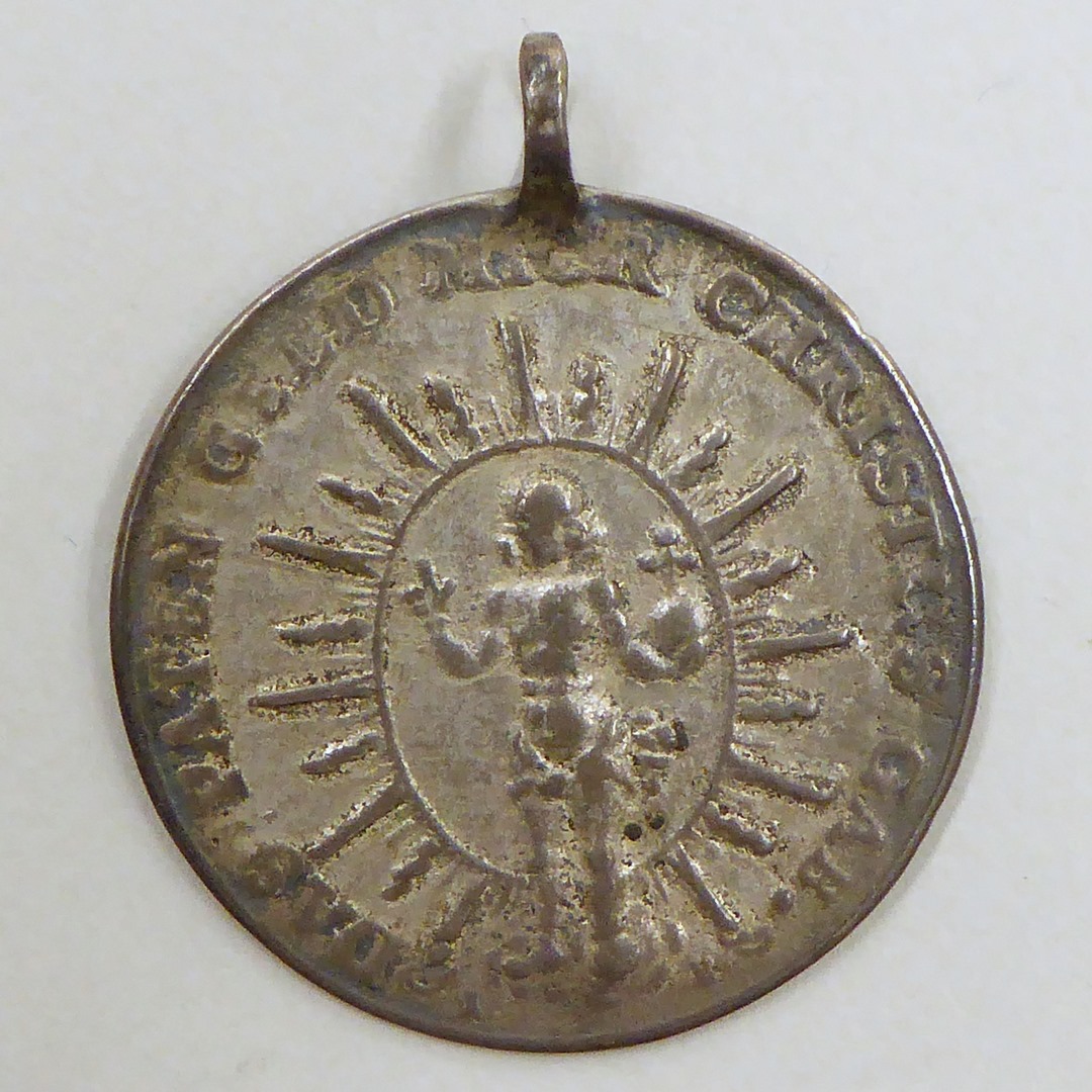 Draagpenning met naakt Christuskind in stralenkrans, kz. Jezus zittend op graf met kruis
