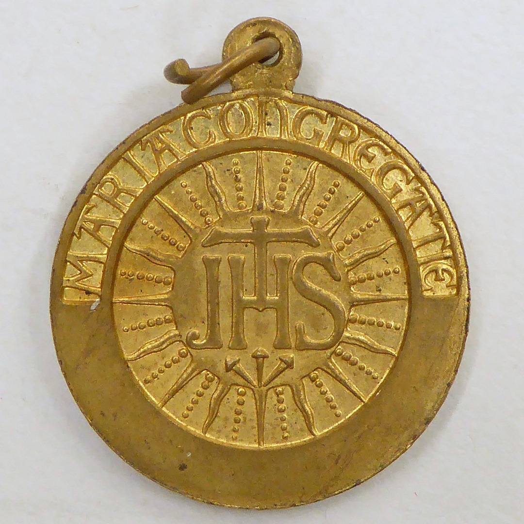 Lidmaatschapspenning met Maria met kind en "Koningin ...", kz. met "Mariacongregatie" en "IHS"