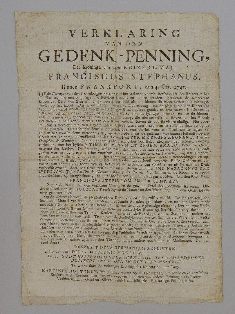 Verklaring van den gedenk-penning der kroninge van zyne keizerl. maj. Franciscus Stephanus, binnen Frankfort, den 4. Oct. 1745