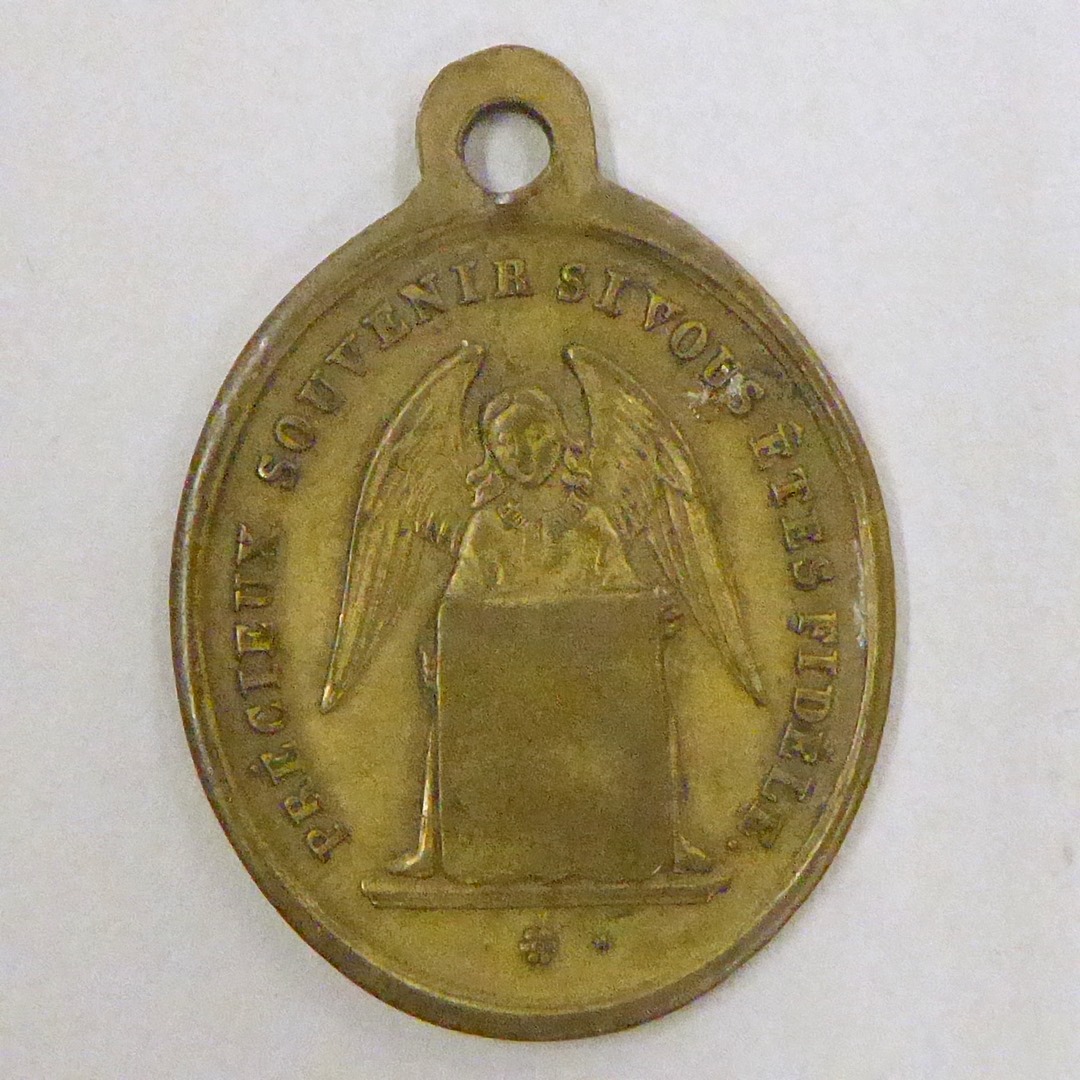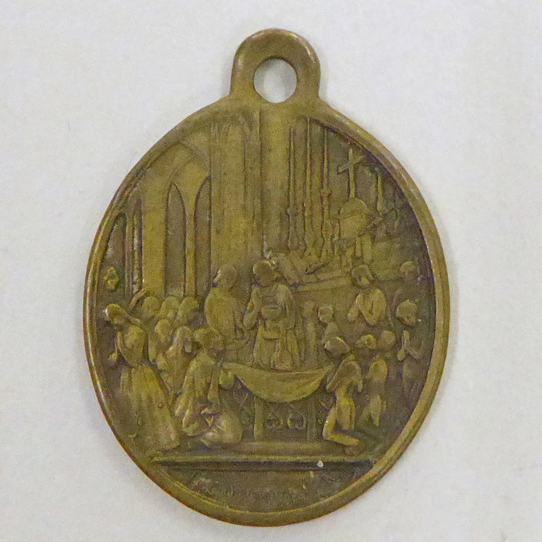 Draagpenning eerste H. Communie met engel met wapenschild, kz. uitdeling van de communie