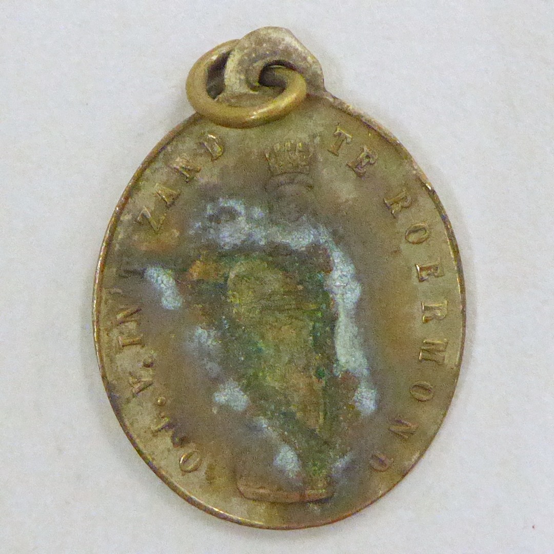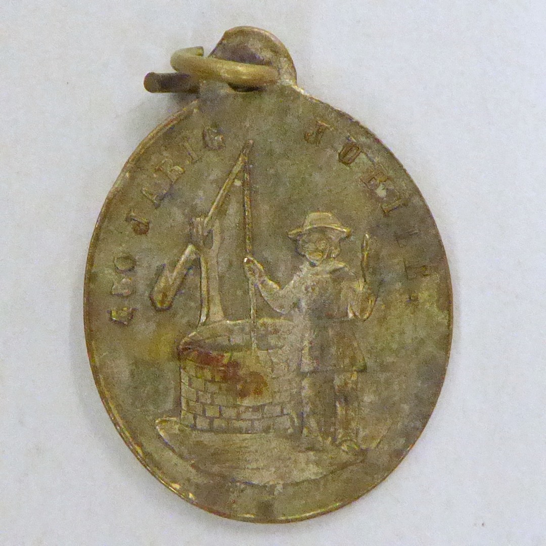 Bedevaartspenning 450-jarig jubileum O.L. Vrouw in 't Zand Roermond met Maria, kz. herder bij put