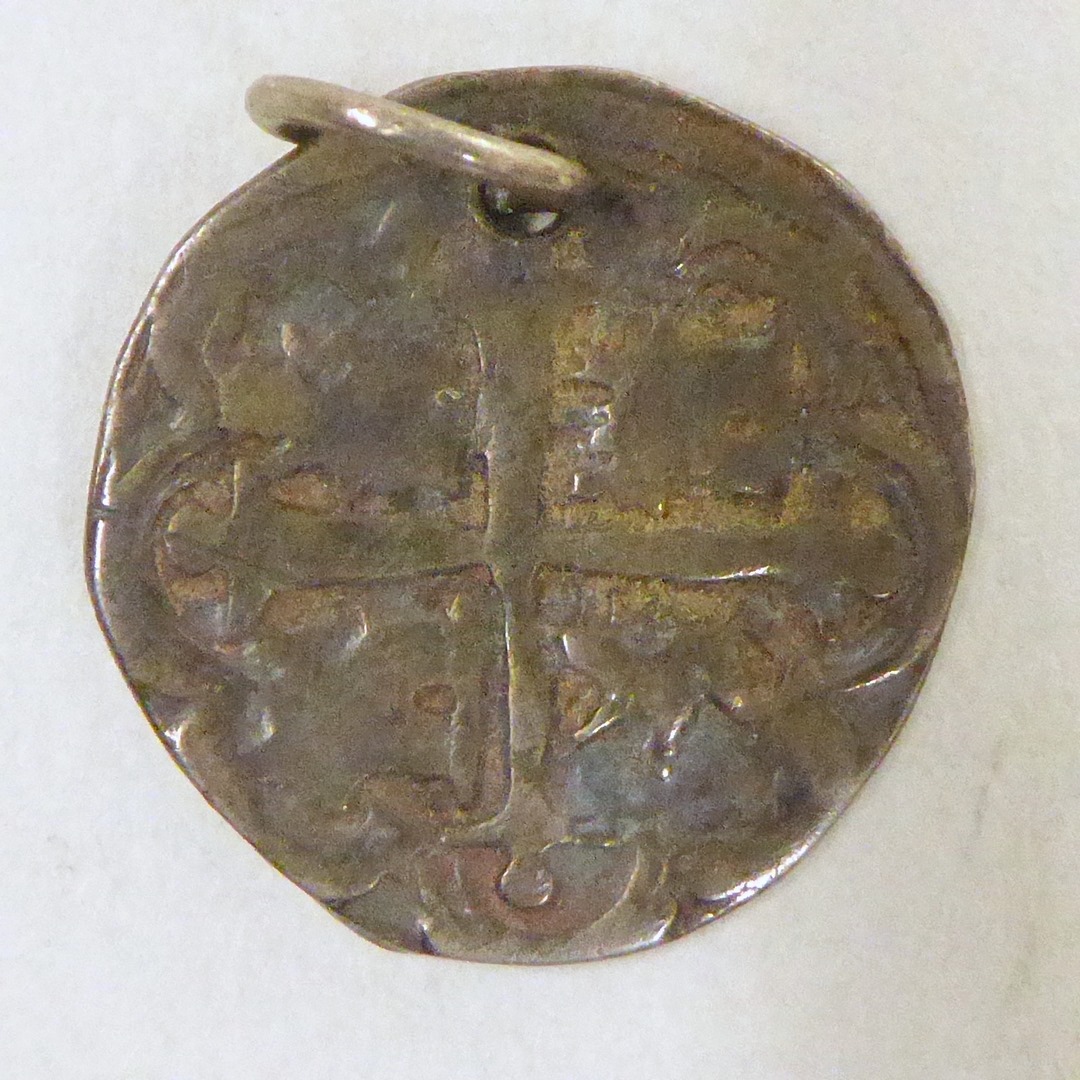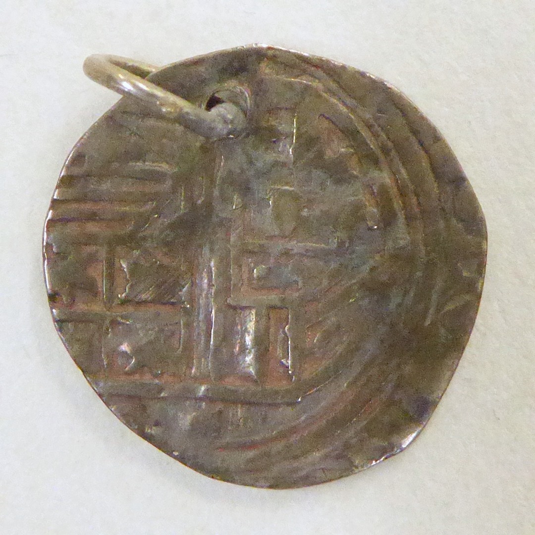 Munt met gaatje van koning Philips II met kruis, twee leeuwen en twee kastelen, kz. wapen Philips II
