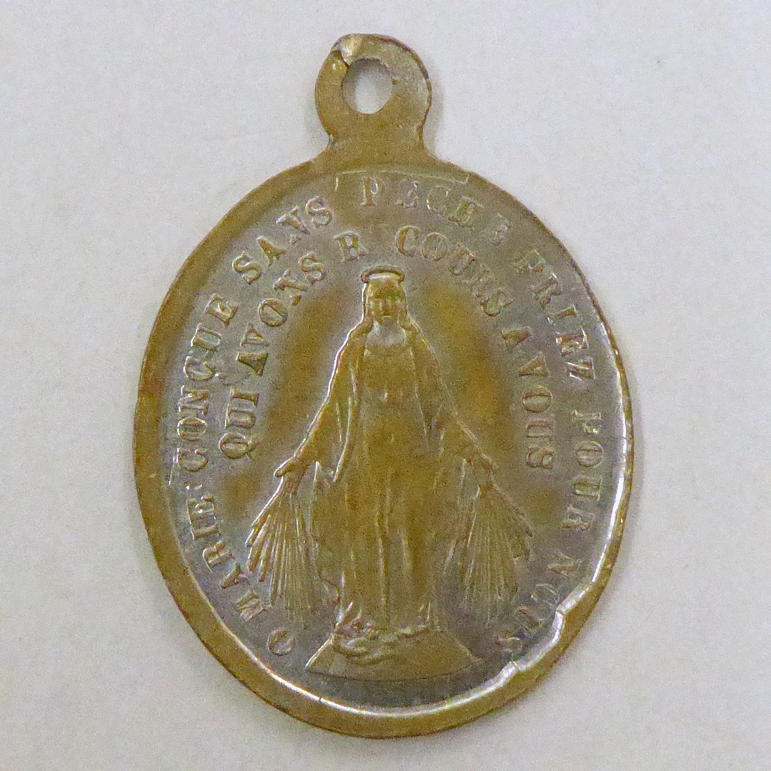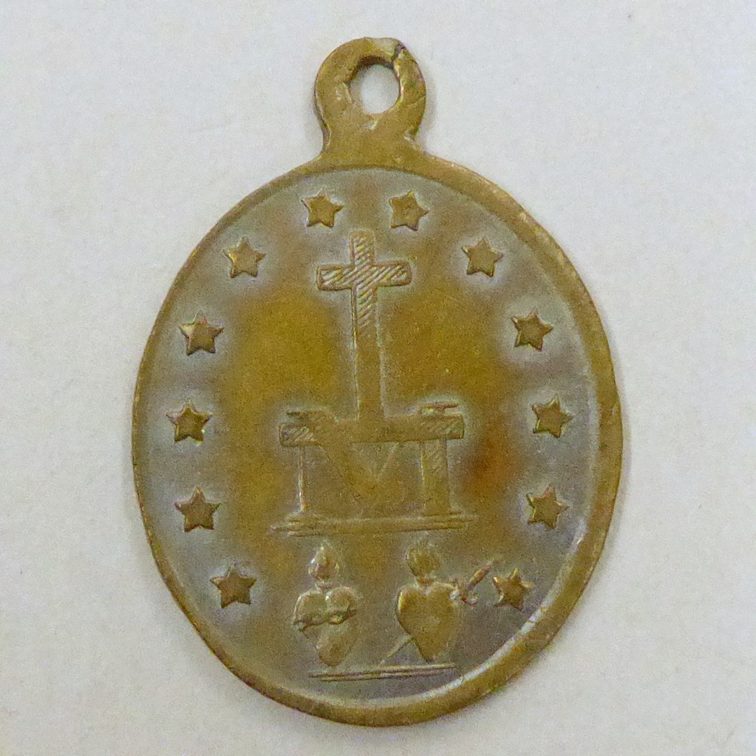 Draagpenning Maria van de Wonderdadige Medaille, kz. H. Harten van Maria en Jezus en monogram