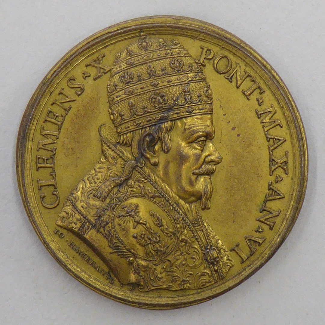 Pauspenning met portret paus Clemens X (1670-1676), kz. St. Pieterskerk en plein Rome