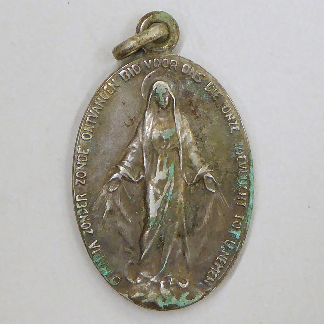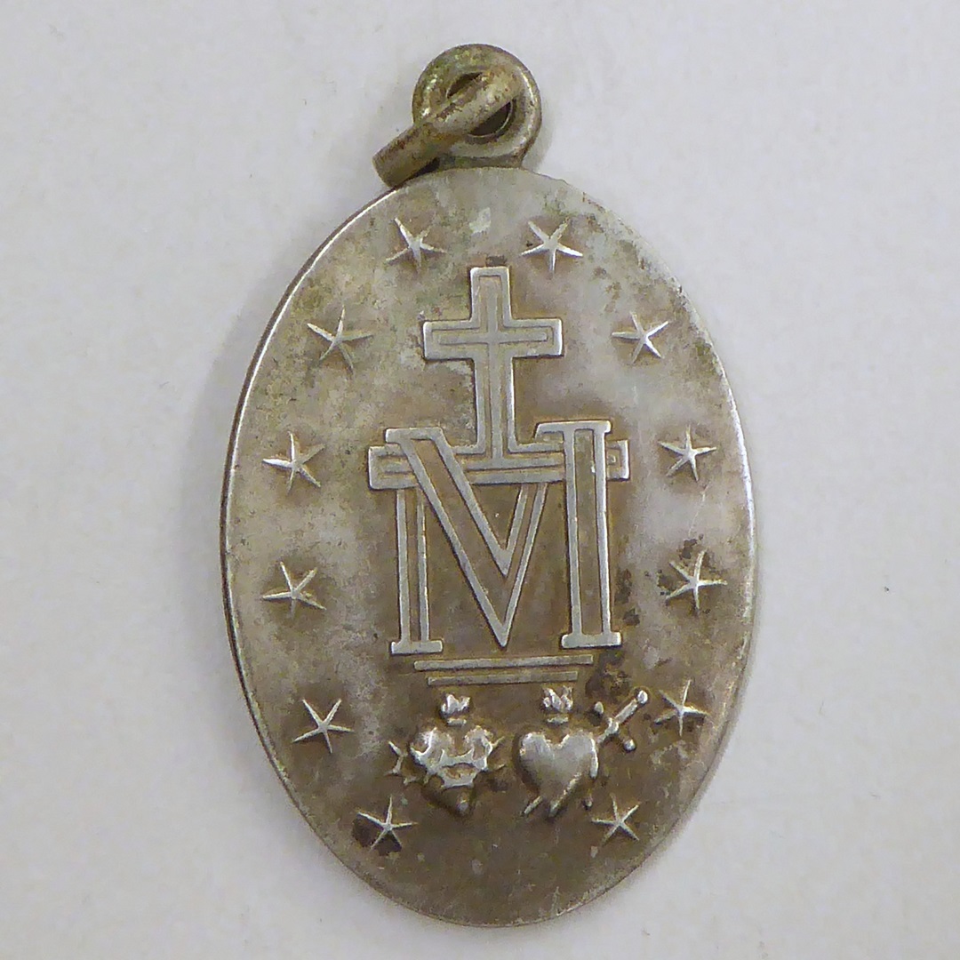 Draagpenning met O.L. Vrouw van de Wonderdadige Medaille, tekst, kz. H. Harten van Jezus en Maria