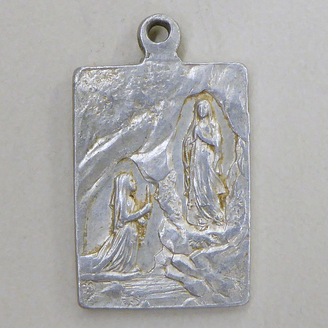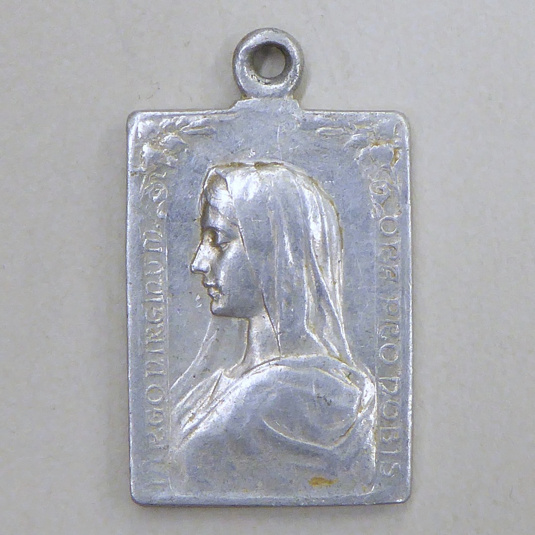Bedevaartspenning, rechthoekig, met portret van Maria en profil, kz. O.L. Vrouw van Lourdes