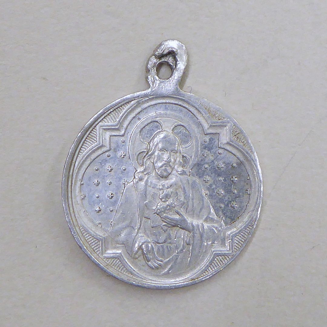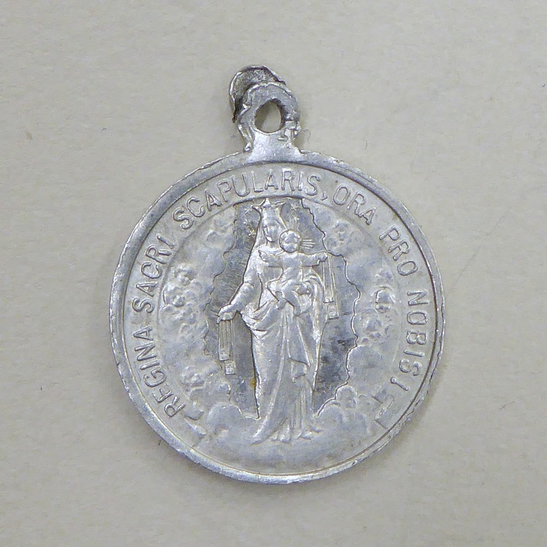 Scapuliermedaille met O.L. Vrouw met Jezus die scapulieren aanreiken, kz. Christus met H. Hart
