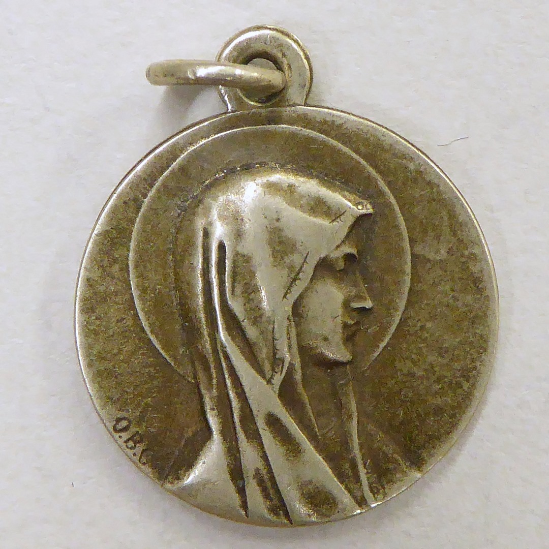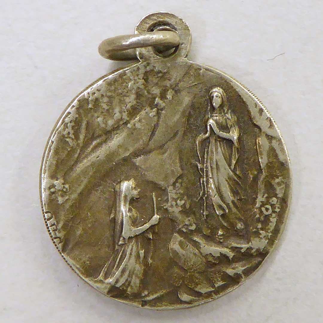 Bedevaartspenning met portret Maria en profil, kz. O.L. Vrouw van Lourdes met verschijning