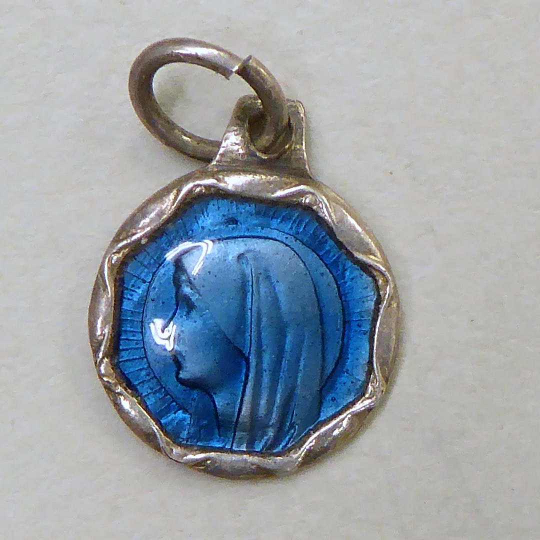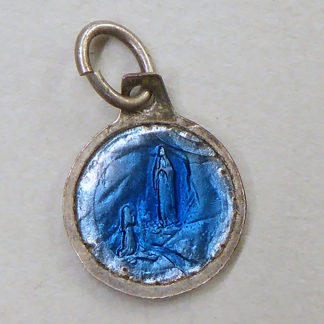 Blauw bedeltje O.L. Vrouw van Lourdes met verschijning, kz. portret Maria en profil