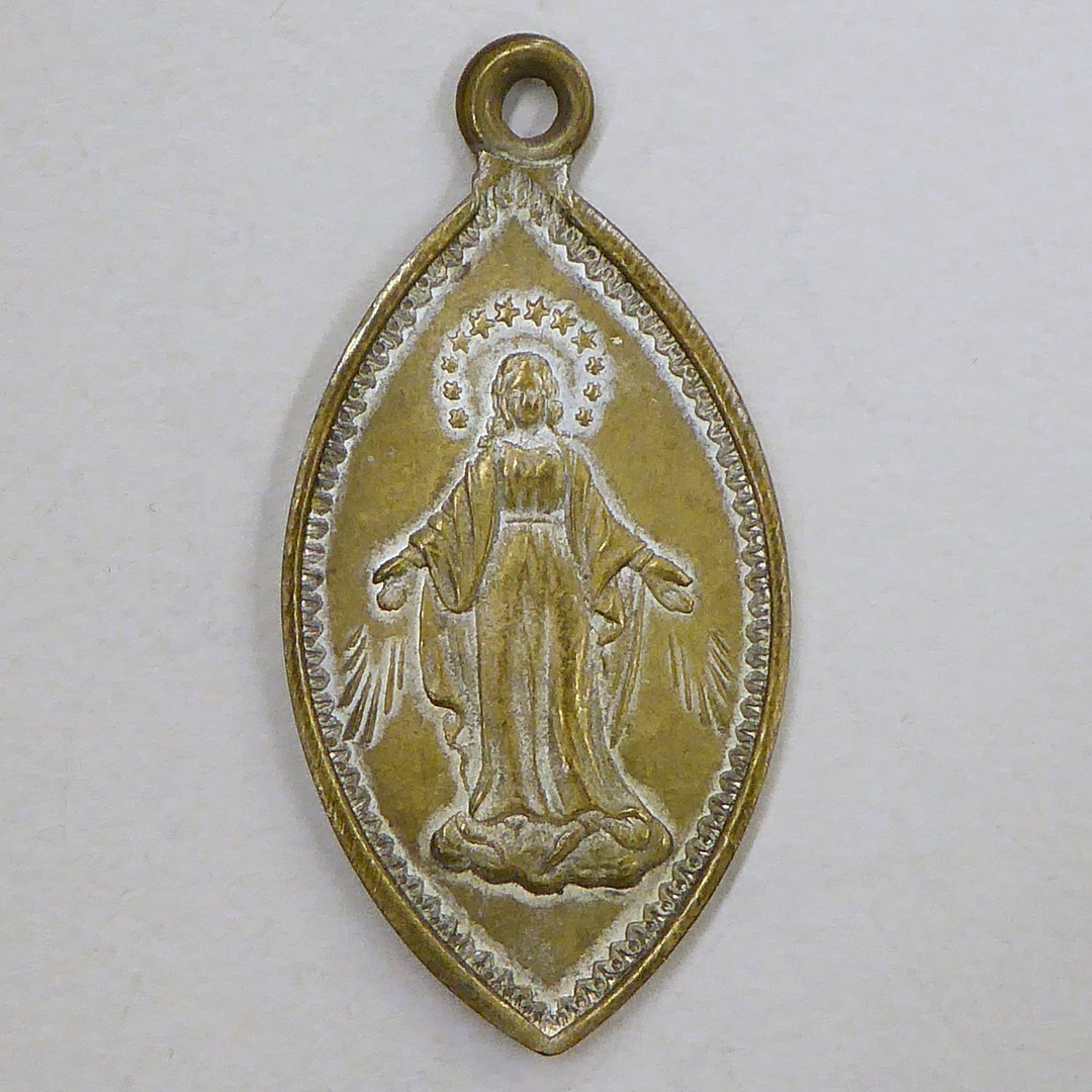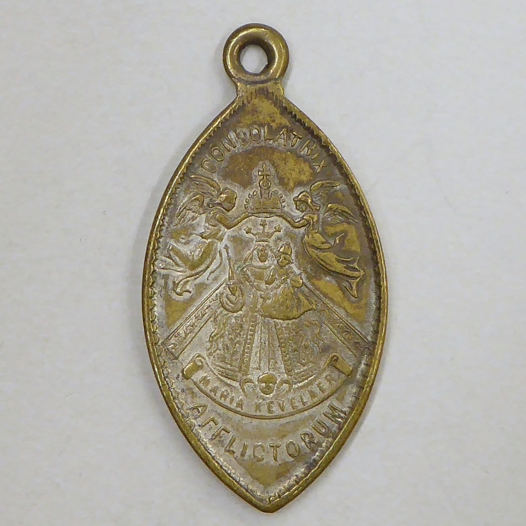 Bedevaartspenning, amandelvormig, O.L. Vrouw van Kevelaer, kz. Maria van de Wonderdadige Medaille