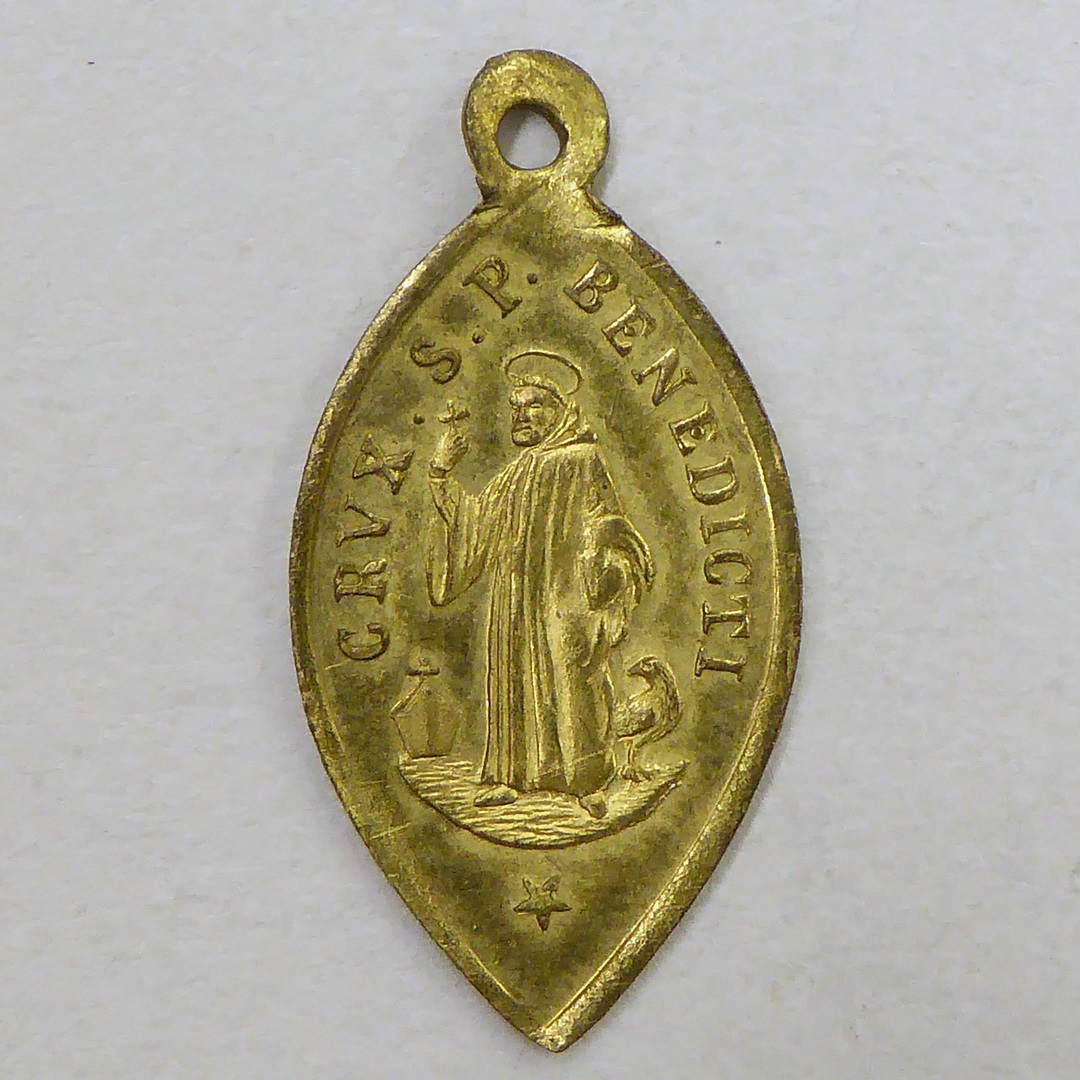 Benedictuspenning, amandelvormig, met H. Benedictus, kz. Benedictuskruis