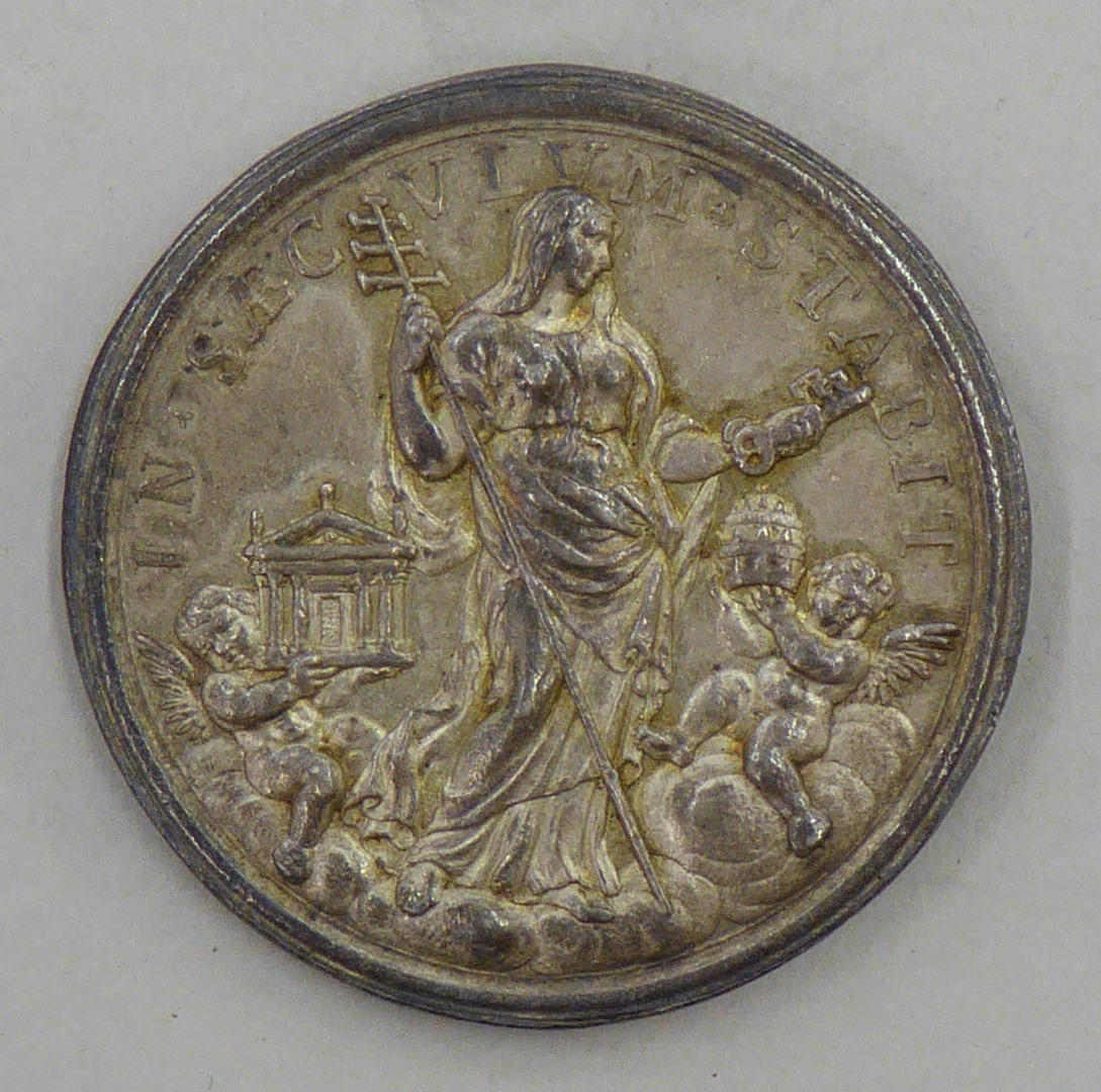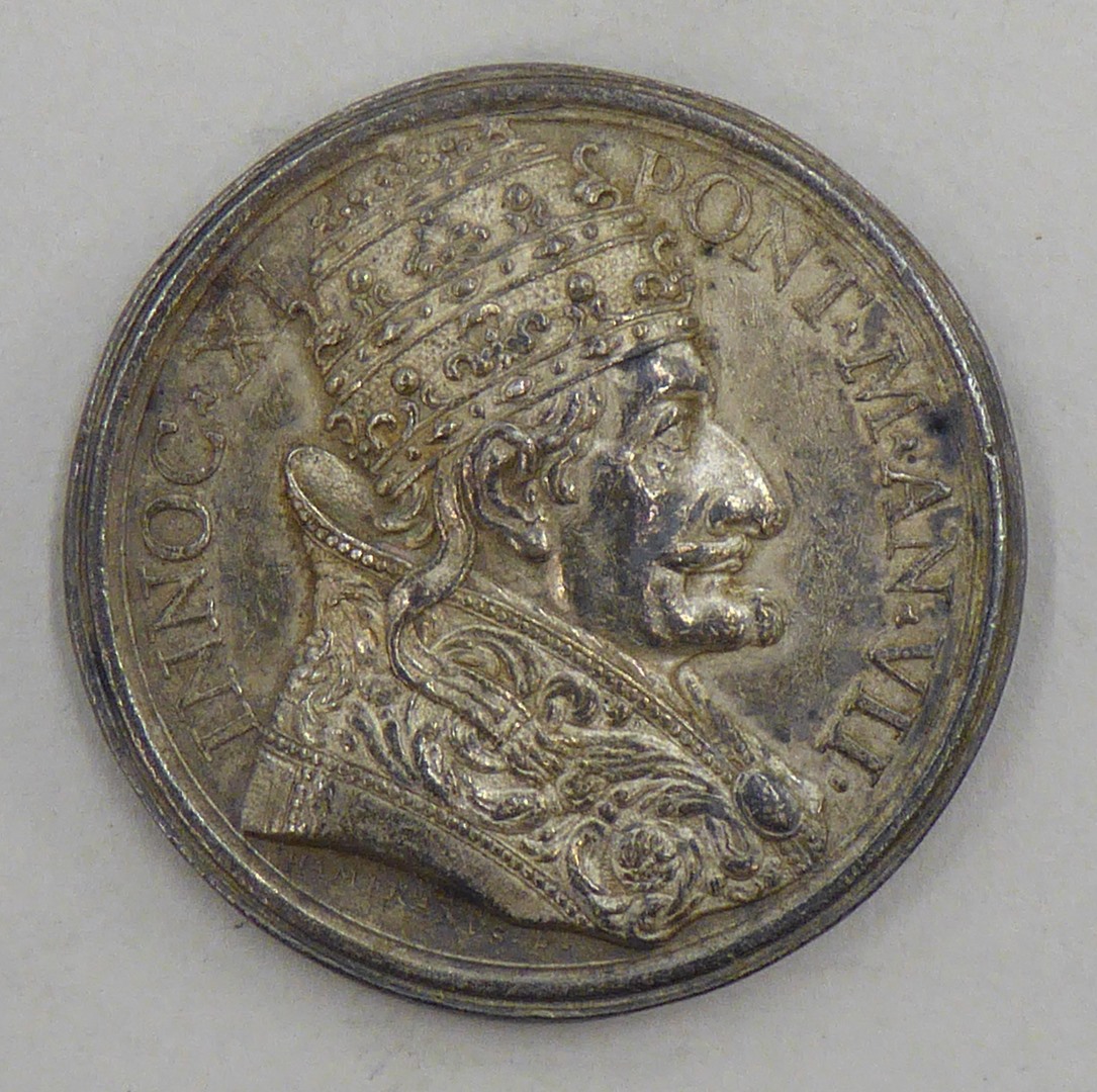 Pauspenning met portret Innocentius XI (1676-1689), kz. allegorische vrouw Ecclesia