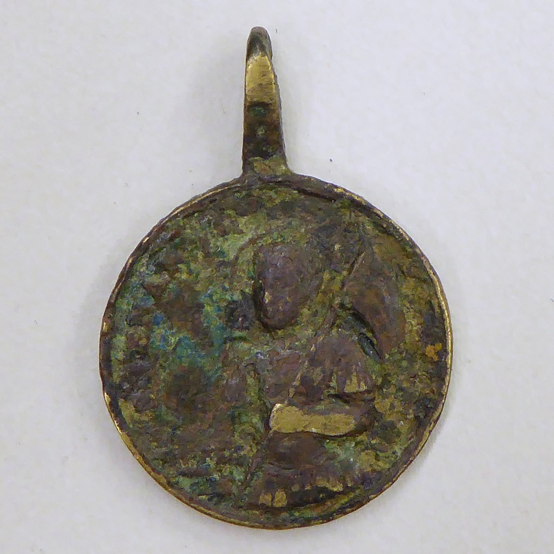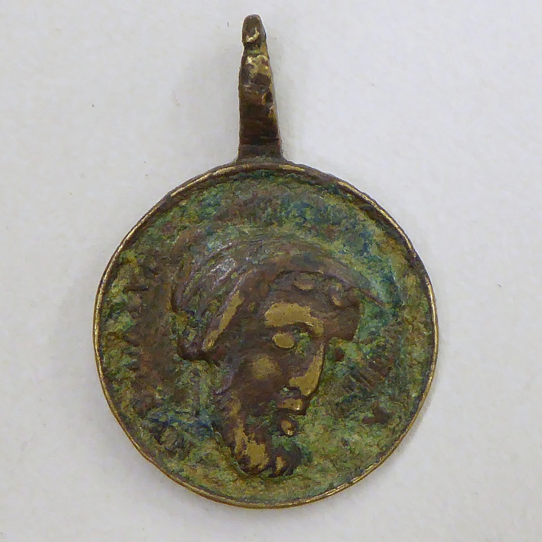 Draagpenning met hoofd gestorven Christus, kz. heilige ridder of engel met vaan