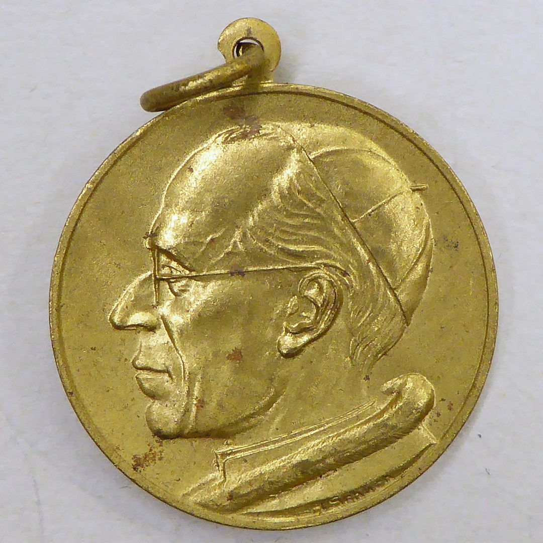 Draagpenning paus Pius XII, vijftig jaar priester, met portret, kz. tekst, sleutels en tiara