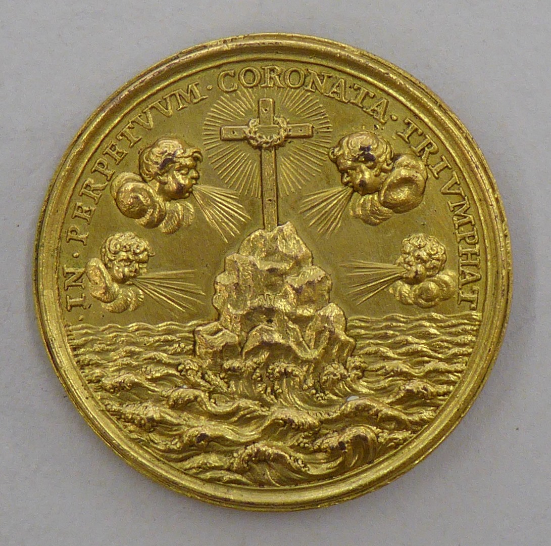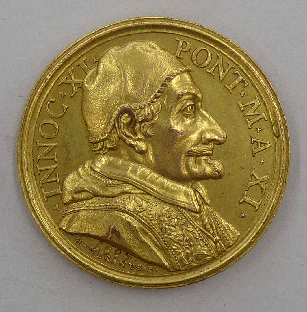 Pauspenning met portret Innocentius XI (1676-1689), kz. kruis op rots in zee