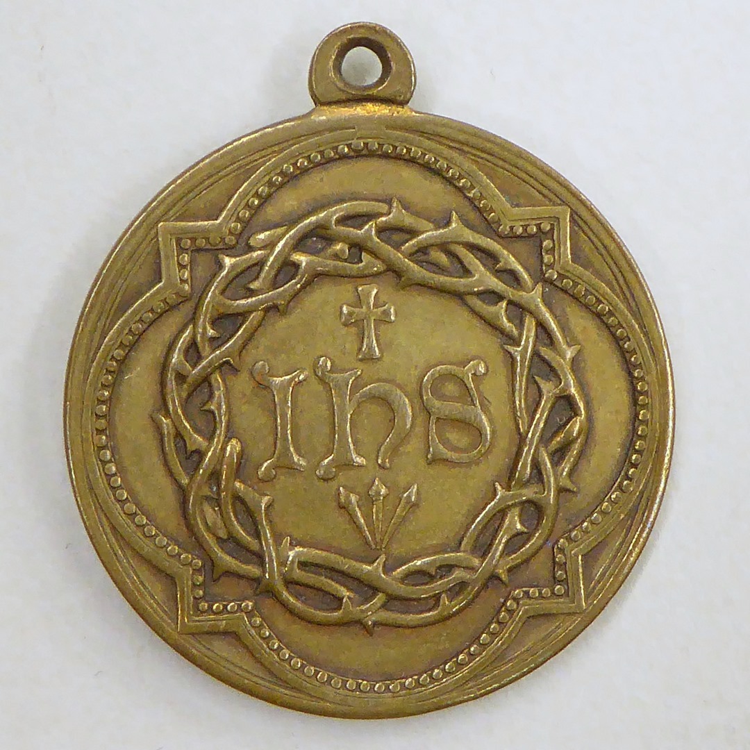 Draagpenning H. Ignatius van Loyola, kz. doornenkroon, Christusmonogram en H. Nagelen