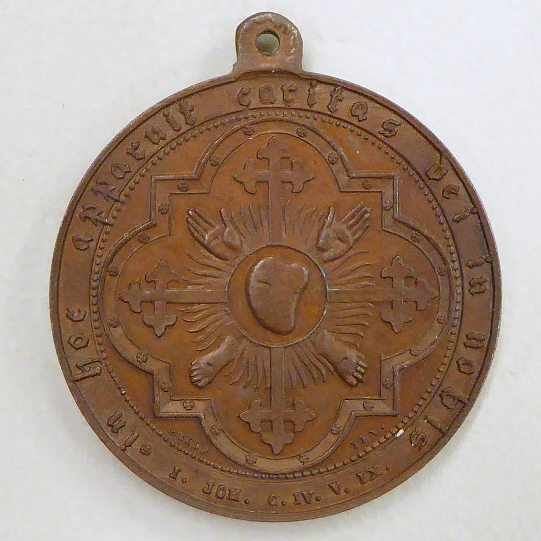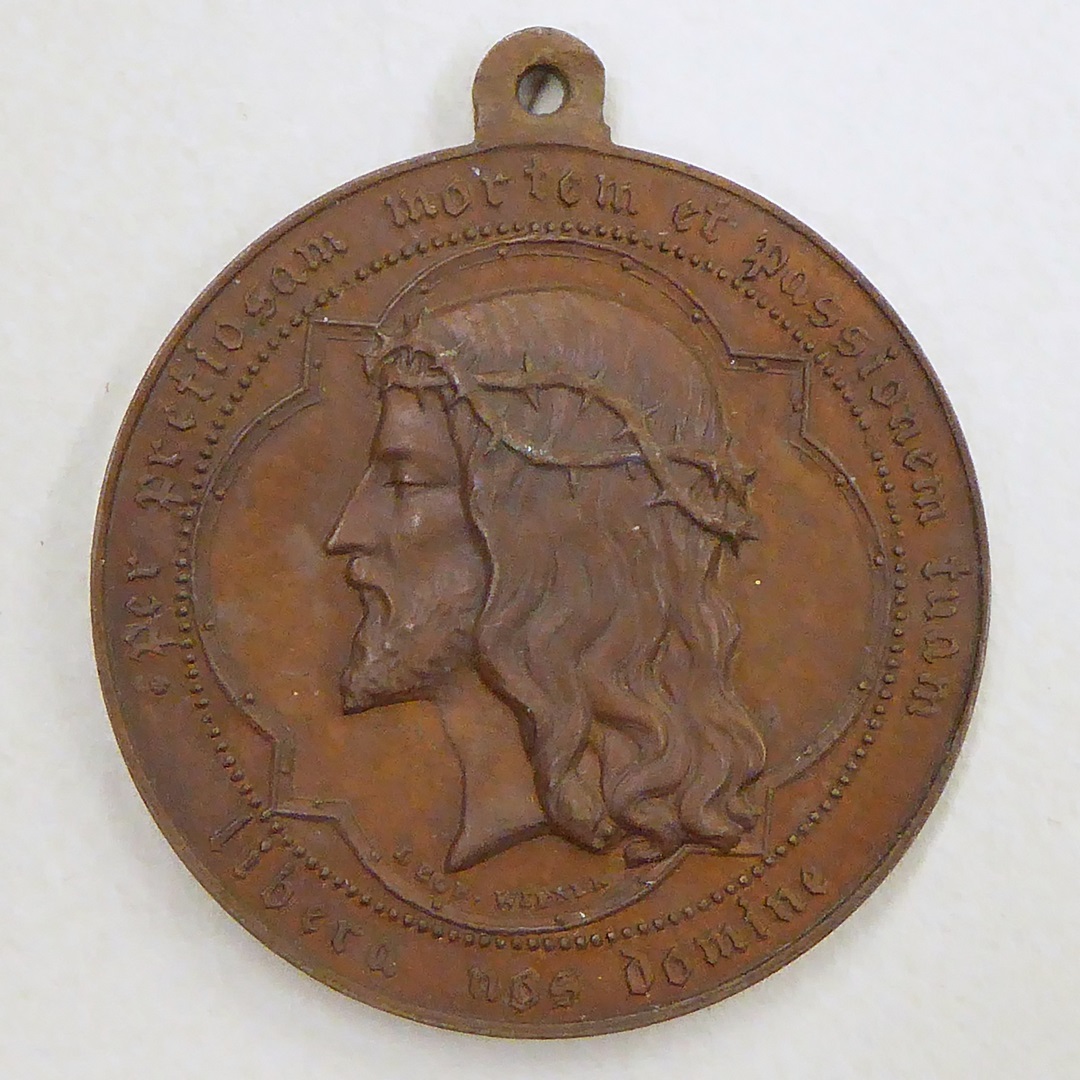 Draagpenning met portret van Christus met doornenkroon, kz. H. Hart en de vier andere wonden