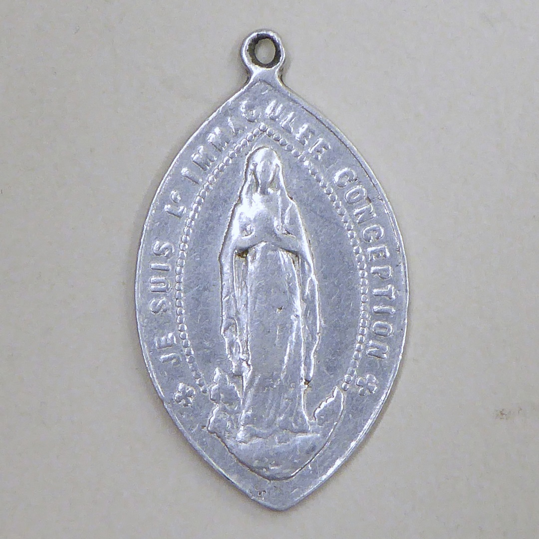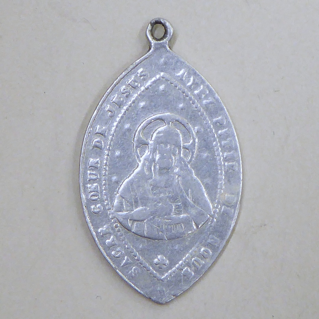 Draagpenning, amandelvormig, met O.L. Vrouw van Lourdes, kz. Christus met H. Hart