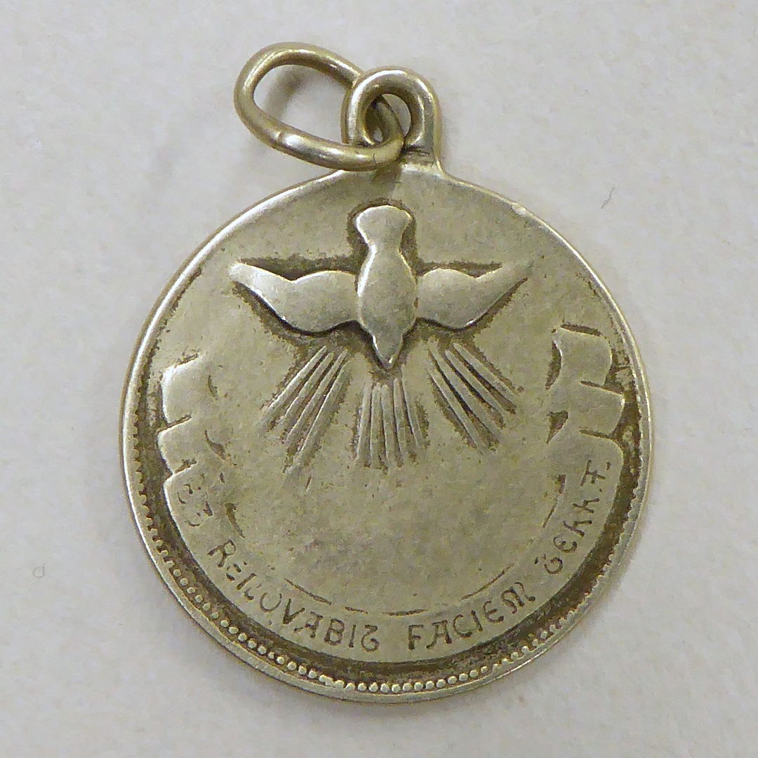 Draagpenning met pinksterwonder, kz. H. Geest, stralenbundel en banderol met tekst