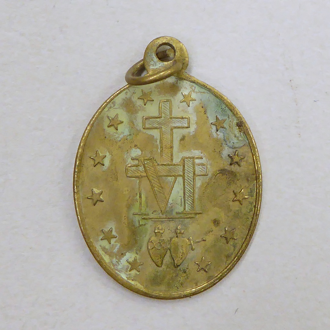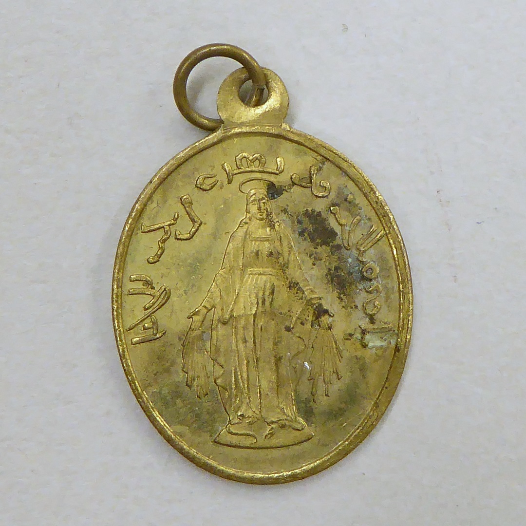 Draagpenning met O.L. Vrouw van de Wonderdadige Medaille en Arabische(?) tekst, kz. H. Harten