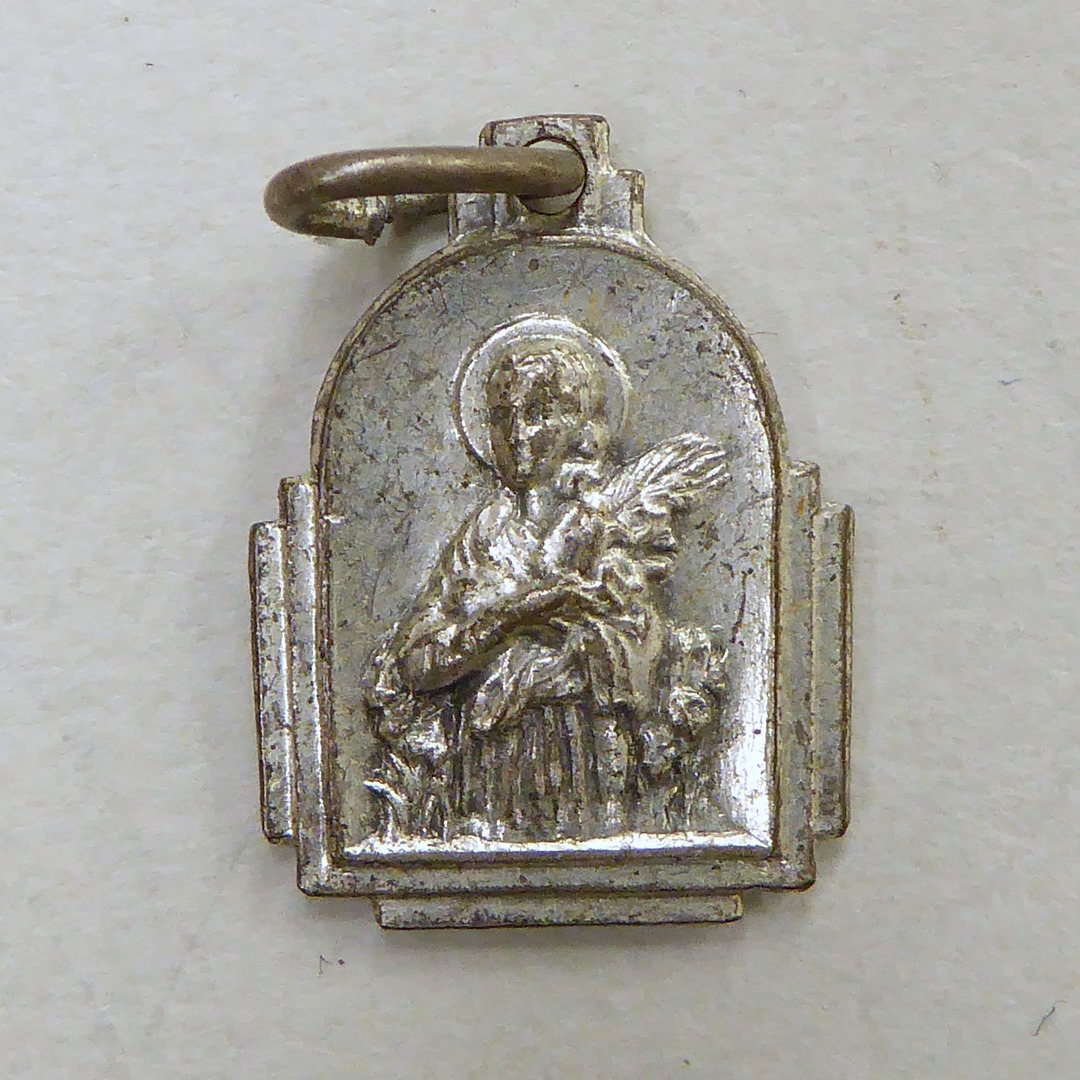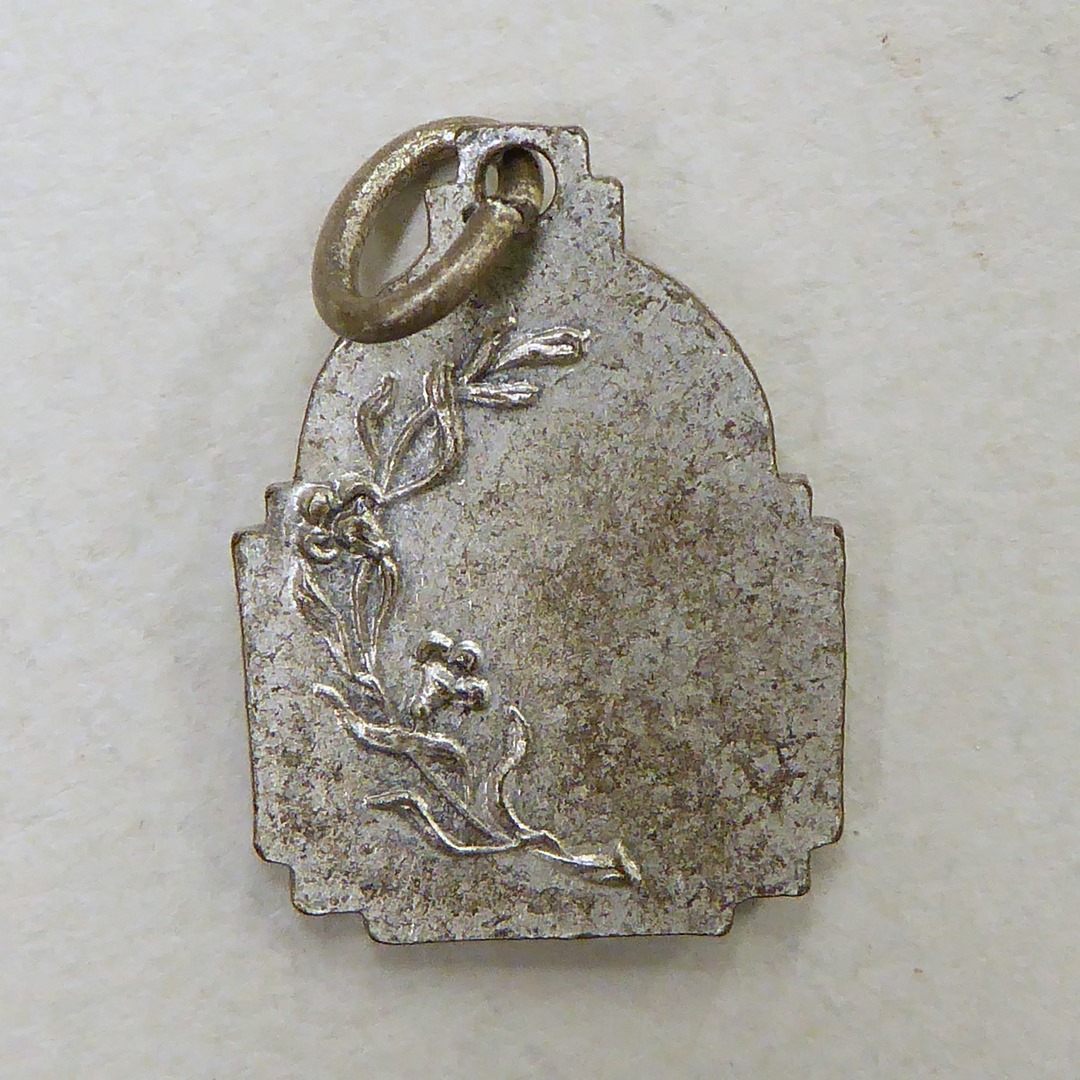 Draagpenning, schildvormig, met vrouwelijke heilige met palm en lelie, kz. lelietak