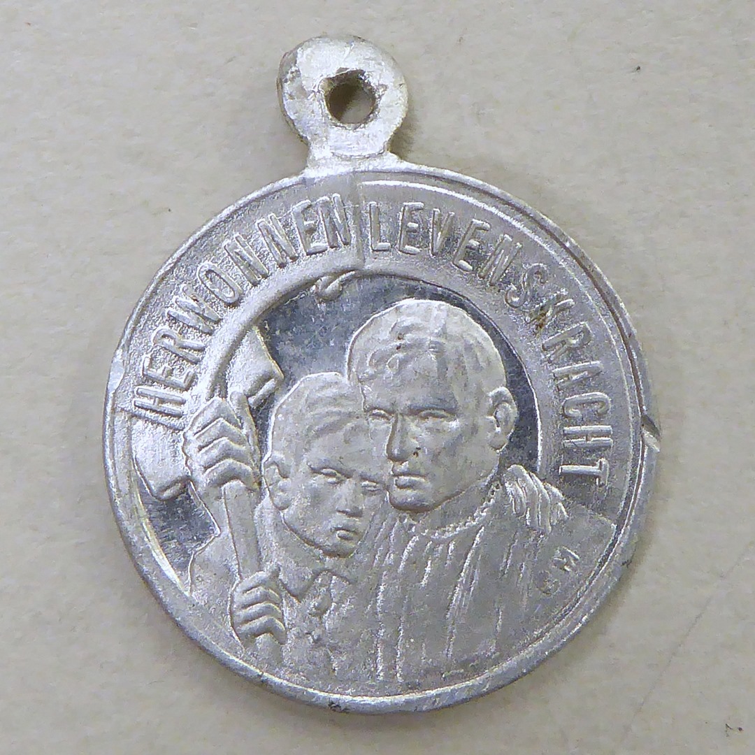 Draagpenning met twee t.b.c.-lijders en "Herwonnen levenskracht", K.A.B., kz. blanco