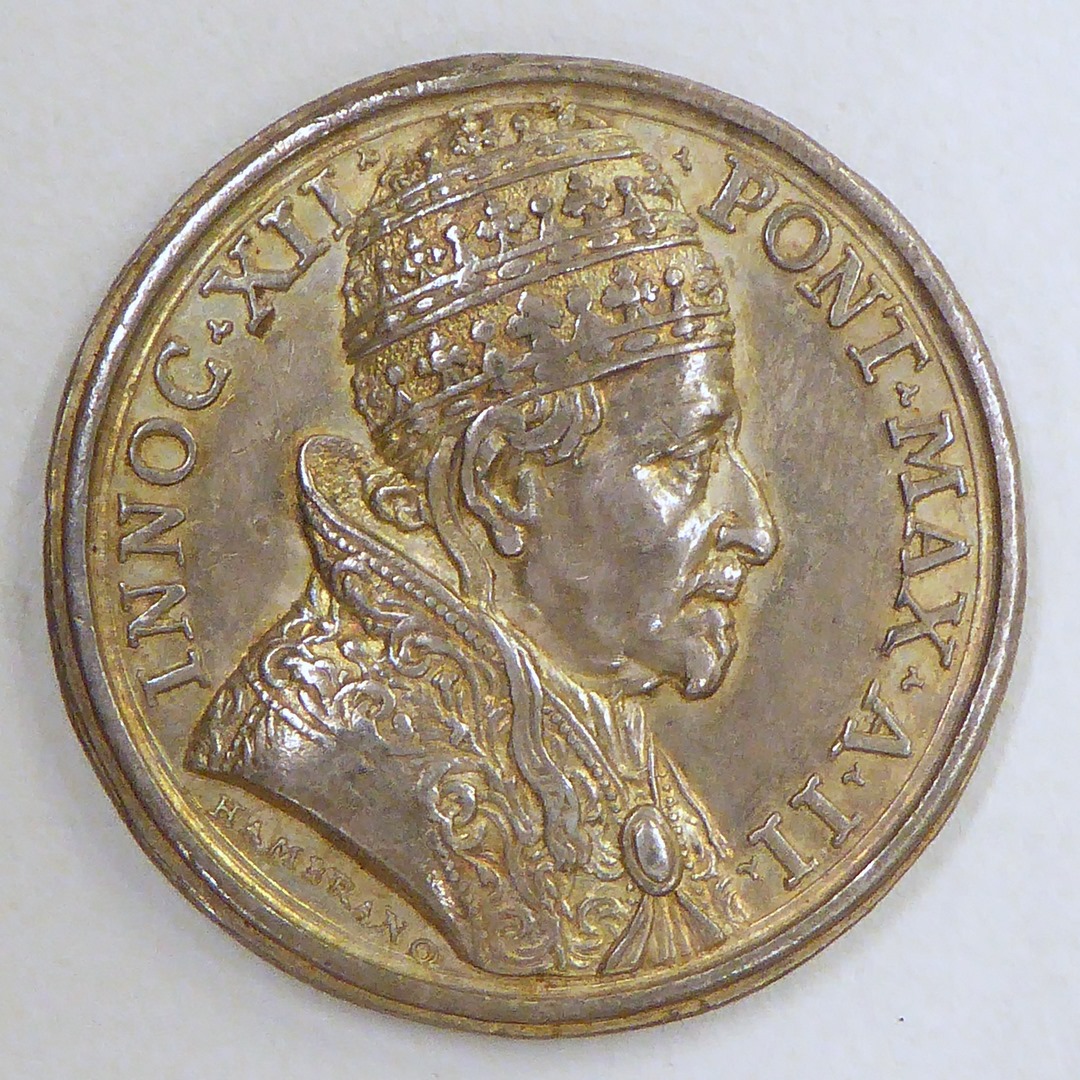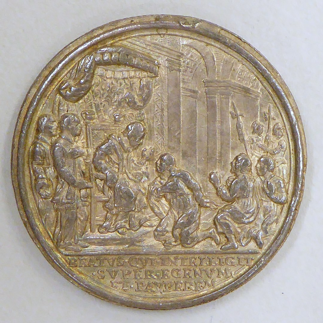 Pauspenning met portret paus Innocentius XII (1691-1700), kz. paus ontvangt armen en misdeelden