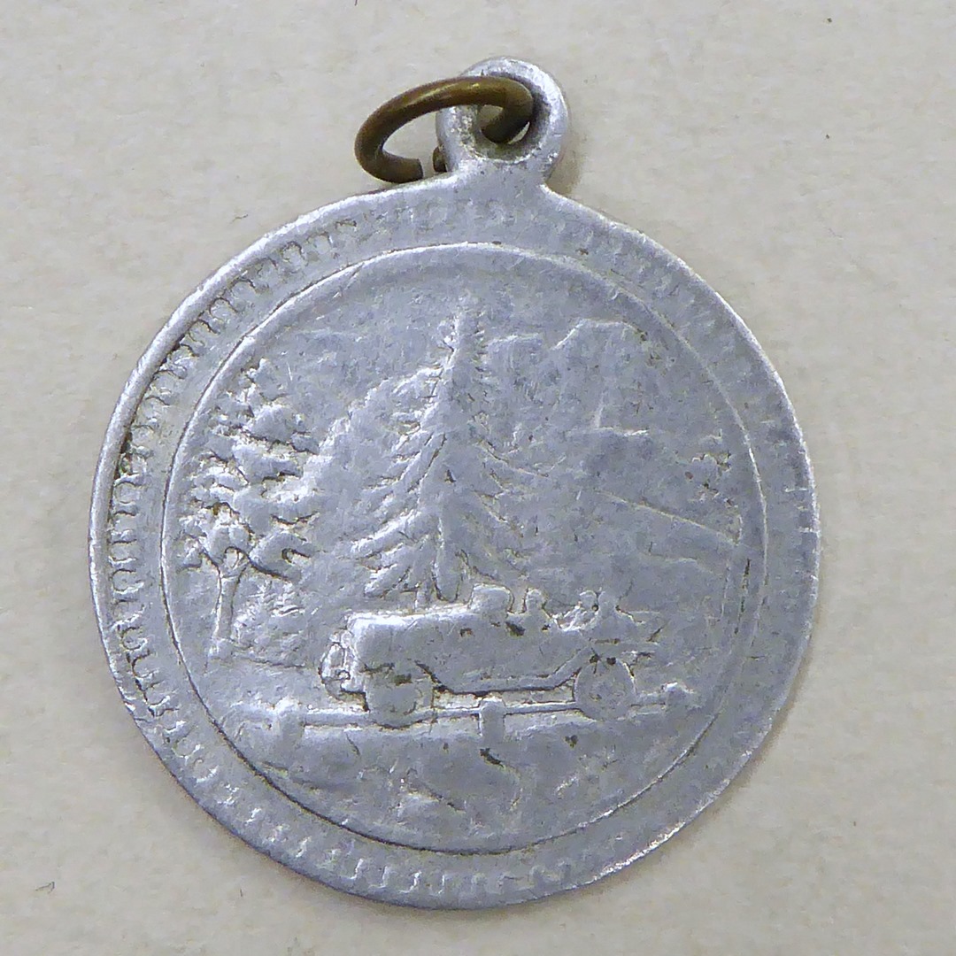 Draagpenning met H. Christoffel met Christuskind wadend door het water, kz. auto in berglandschap