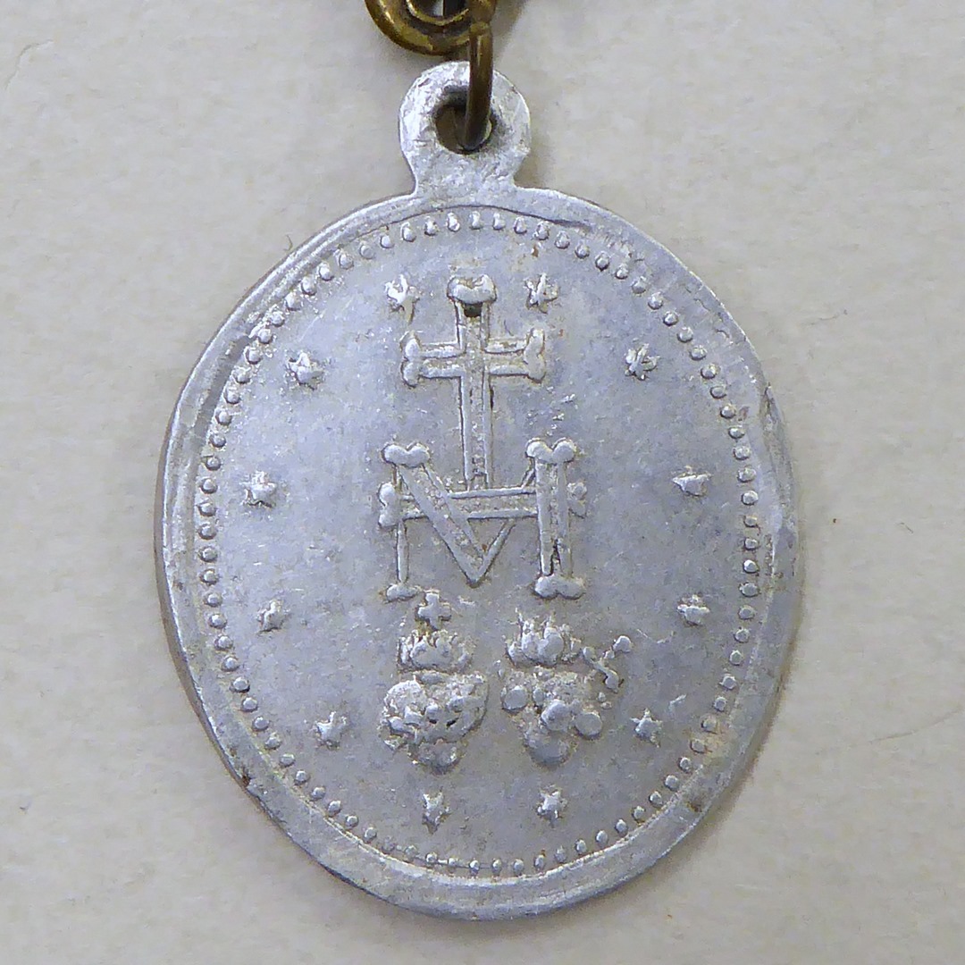 Draagpenning met O.L. Vrouw van de Wonderdadige Medaille, kz. Mariamonogram en H. Harten