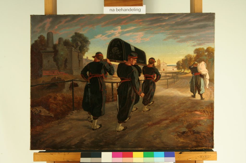 Gesigneerd linksonder: J.Faber / Roma. Gedateerd op de zijkant van de kist: ALBANO / 1867 (datering thans nauwelijks meer zichtbaar). Onder de dragers van de kist bevinden zich de drie Nederlanders die bij Albano omkwamen en bekend staan als de ‘helden van Albano’. Hun namen staan vermeld op de antieke ruïne links: HENDRICUS PETERS / ...