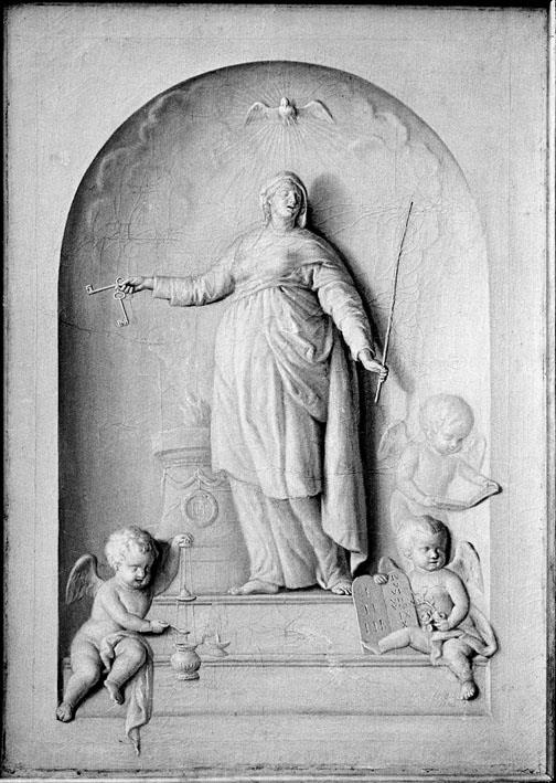 Rechtsonder op de eerste trede gesigneerd en gedateerd: JP v Horstok / 1795. Op de tafelen der wet bij de putto rechtsonder: I t/m X. Aan de voorzijde van het altaar, waarop een vuur brandt, het jezuïetenmonogram.