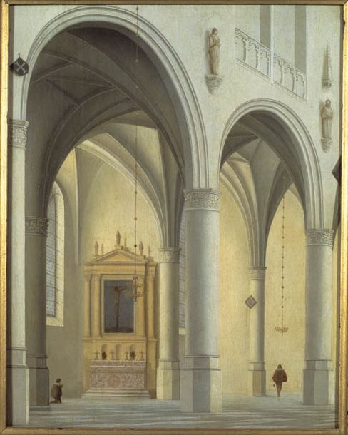 Gesigneerd en gedateerd op de lijst van het triforium: P.SAENREDAM.FECIT. ANNO 1635. Het schild linksboven bevat een kwartier uit het wapen van de familie Uytenhage. Het interieur van de St.-Laurenskerk, die sinds de jaren zeventig van de 16de eeuw in protestantse handen was, is gestoffeerd als een katholieke kerk.