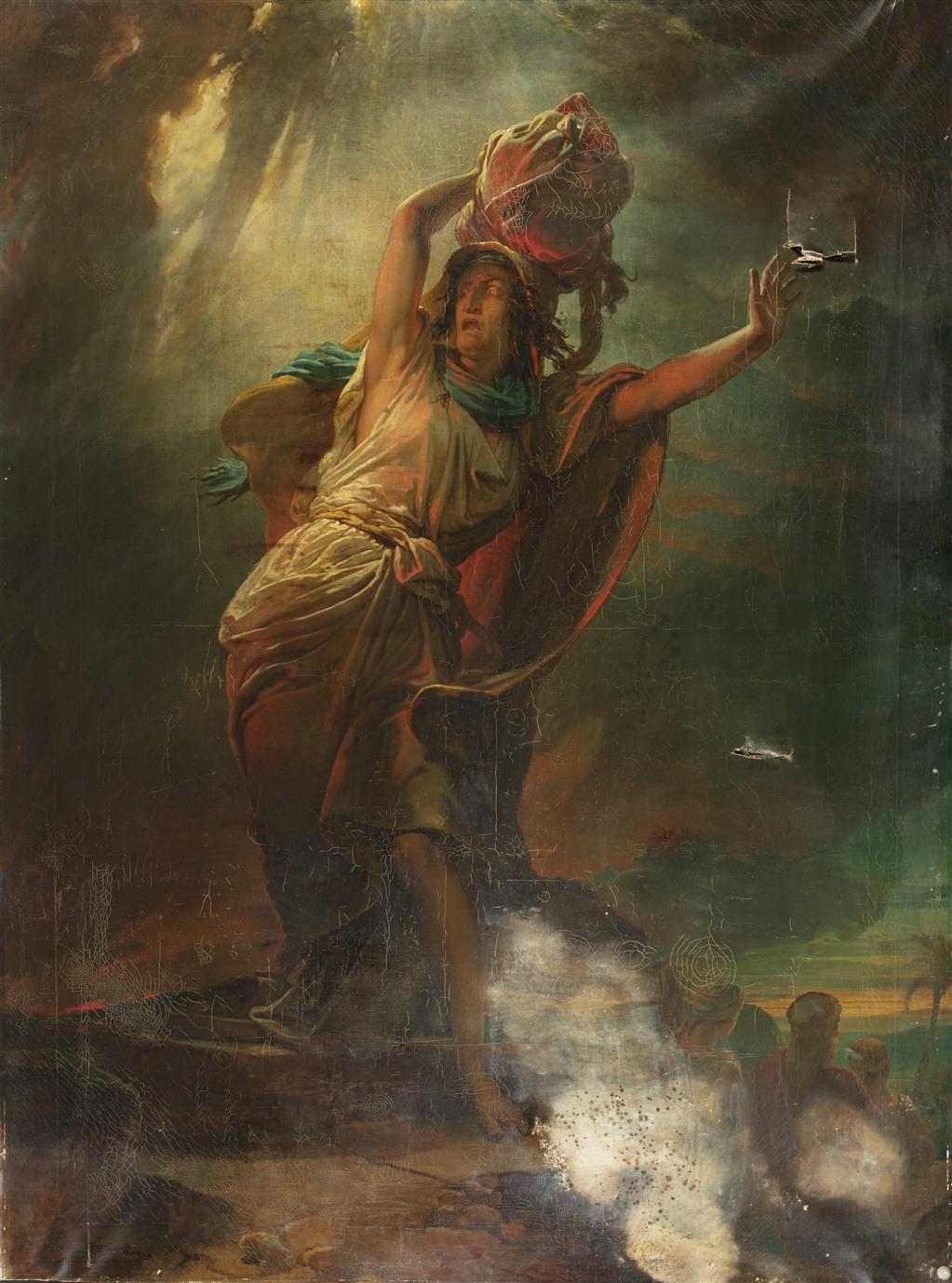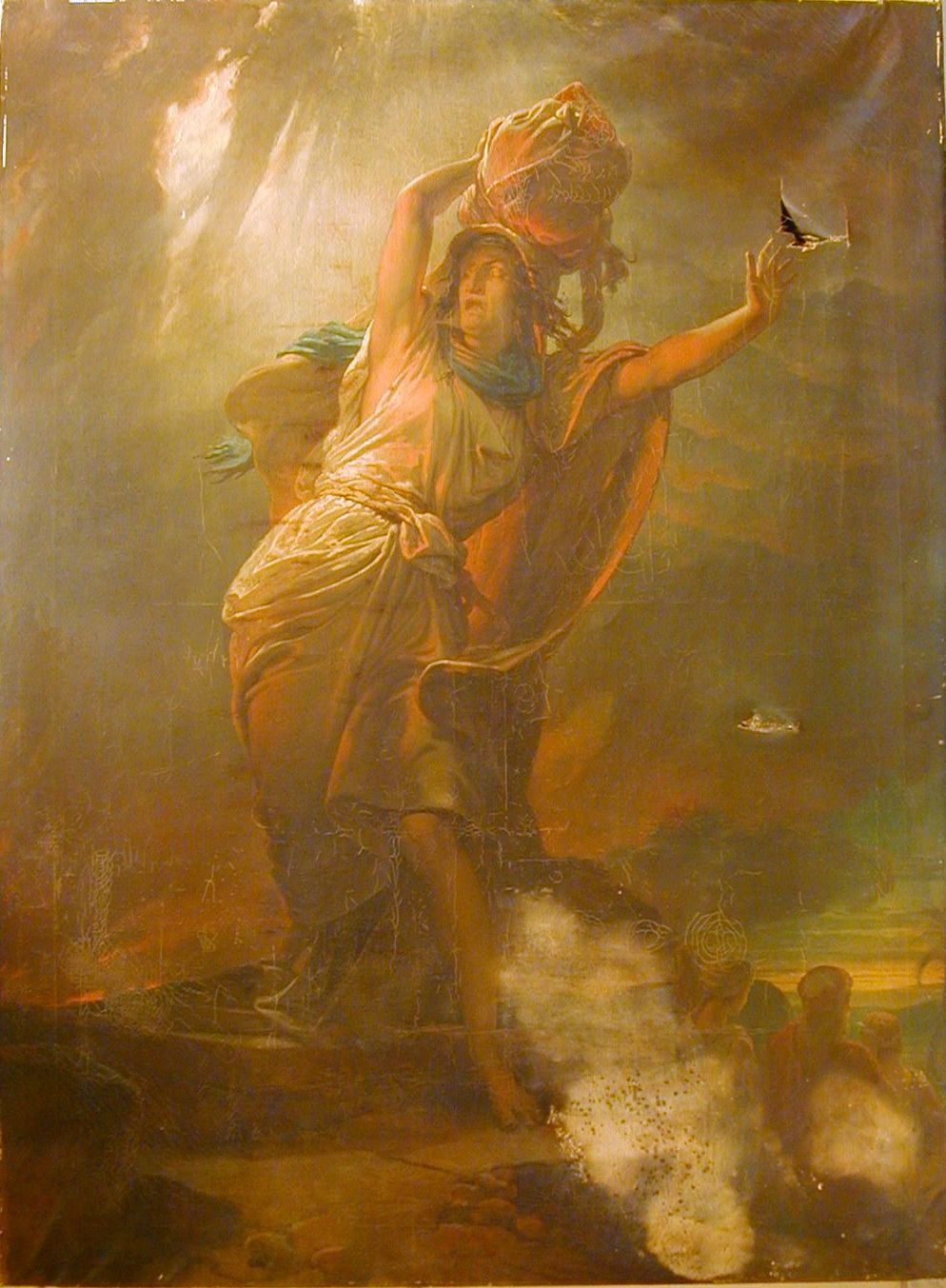 Gesigneerd linksonder: JB Wittkamp / Antwerpen. (JB ineen). Voorgesteld is het moment waarop Lots vrouw tijdens de vlucht uit Sodom omkijkt en in een zoutpilaar verandert.